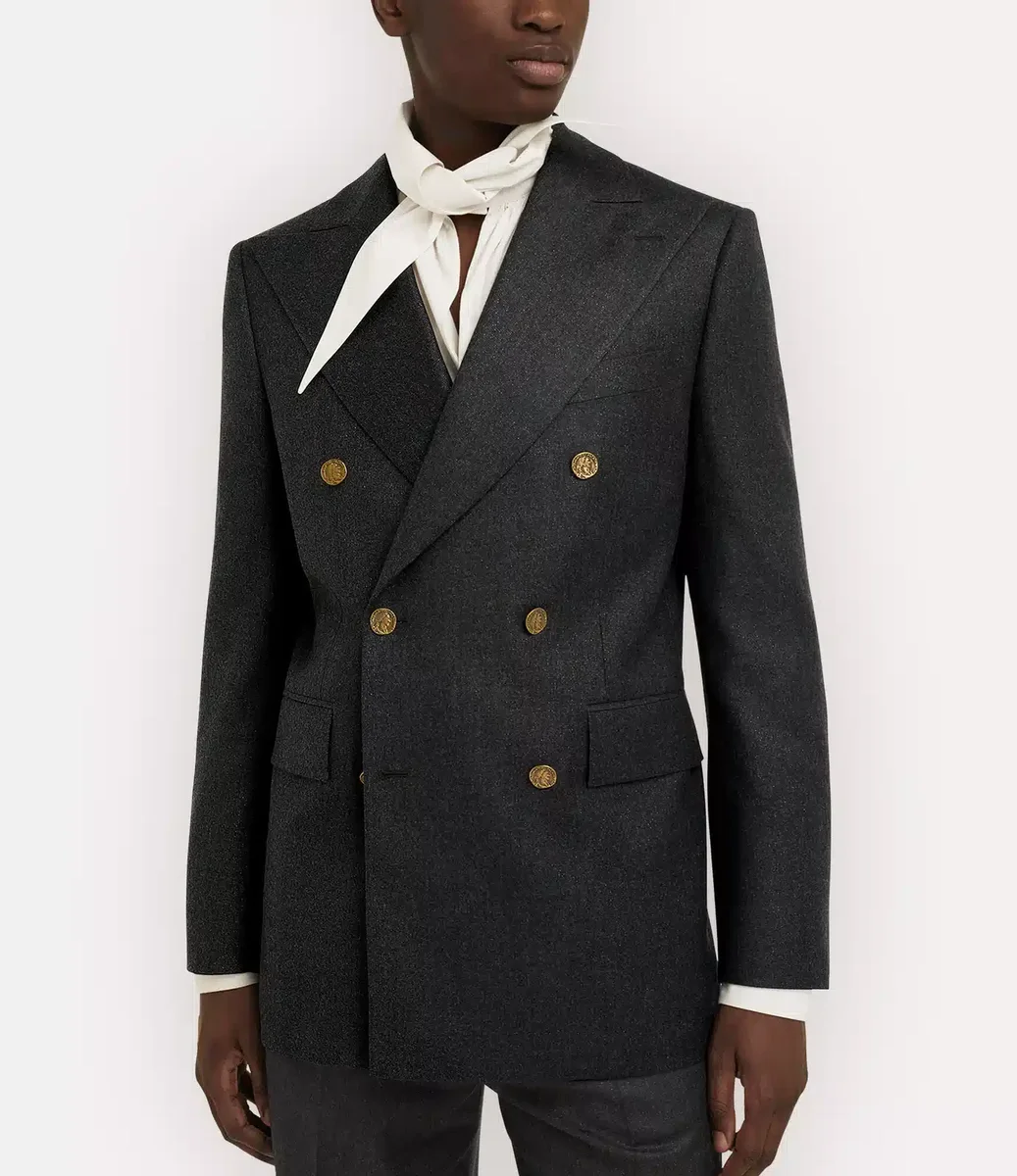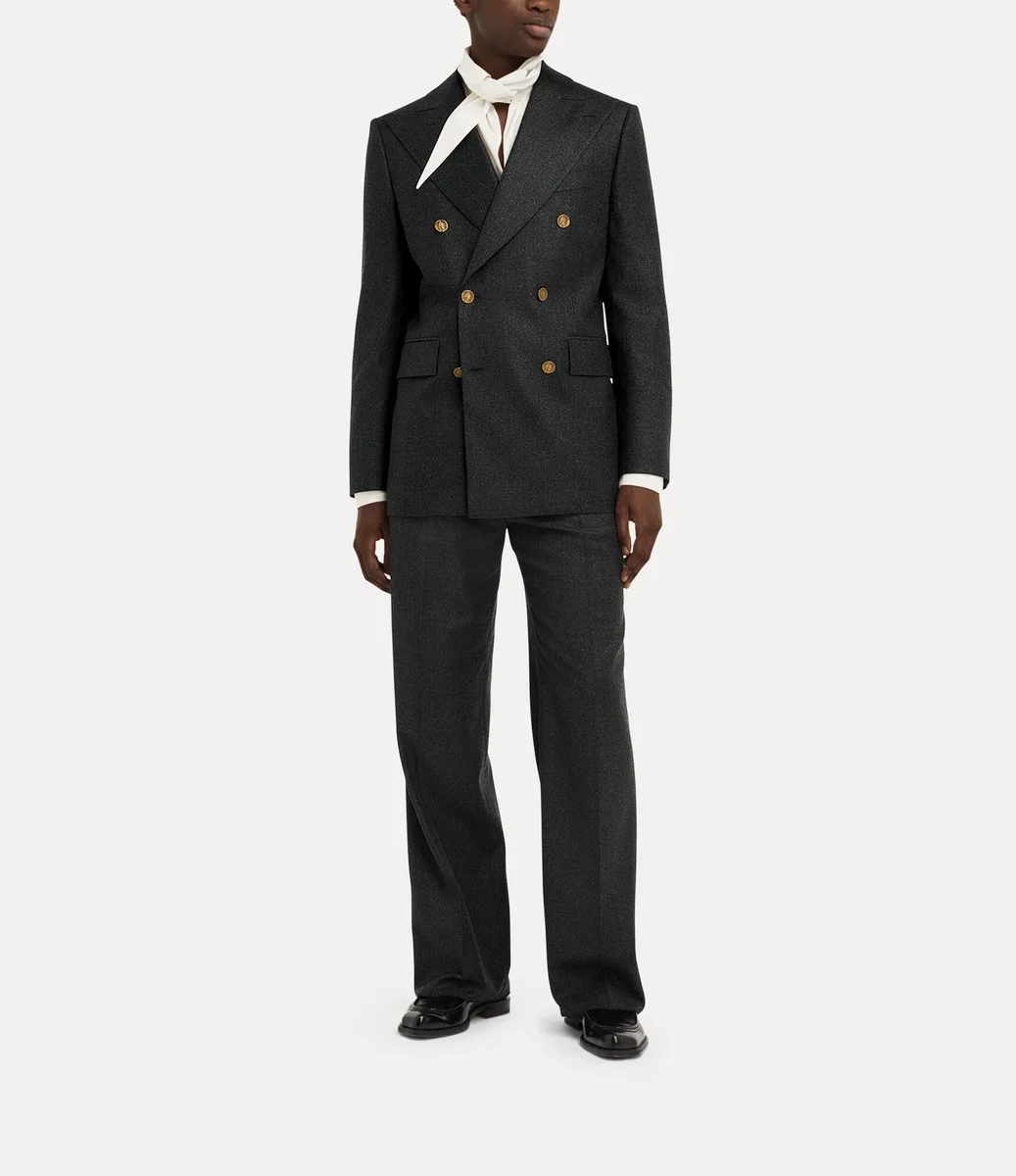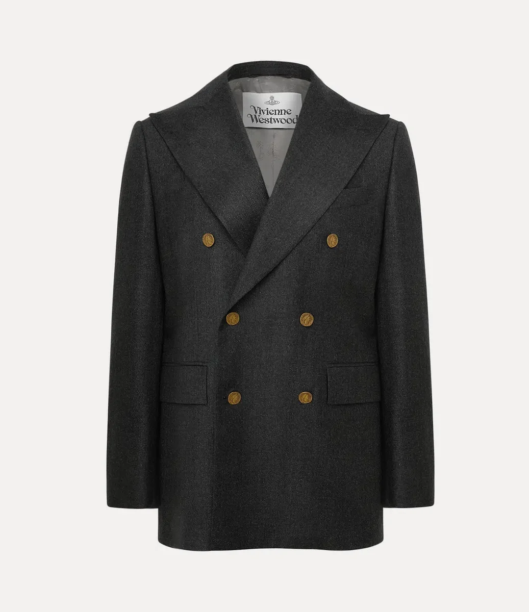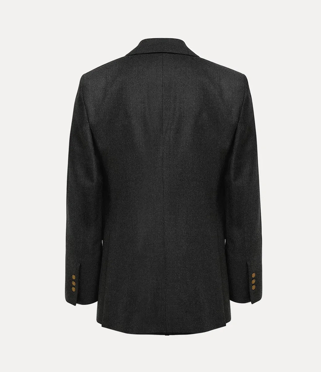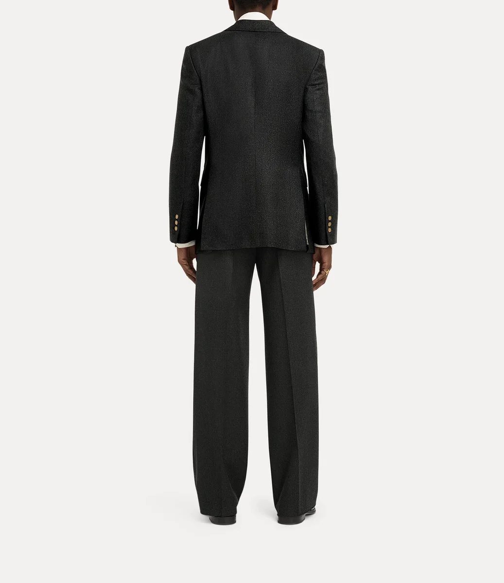 Our Captain jacket features a wool profile, delicately woven with a metallic brushed finish. Framed by sharp peak lapels, the silhouette falls to a clean hemline with rear vents, complete with our ‘Tossed Orb’ interior lining – synonymous with Vivienne’s vision of launching tradition into the future.