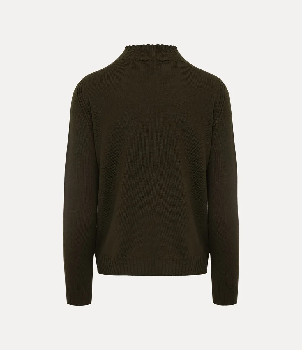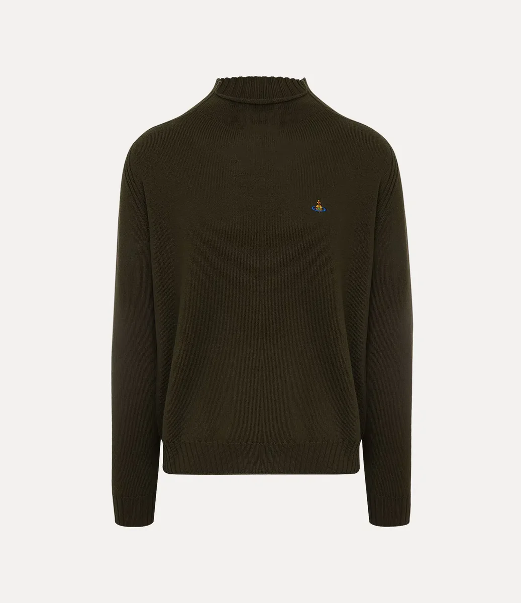 Our Fisherman jumper is crafted from soft wool, featuring a ribbed neckline that extends into a straight hem. Finished with long raglan sleeves with ribbed cuffs, the piece is adorned with a multicoloured embroidered orb on the left-hand side of the chest, recalling Vivienne’s vision of launching tradition into the future.
