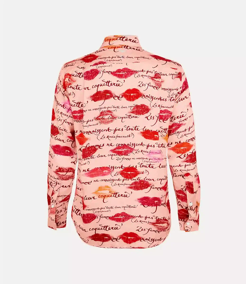 Our Tuxedo shirt features an exaggerated pointed collar, complete with a concealed button placket. The piece is adorned with the ‘Kisses’ artwork, inspired by our ‘Boudoir’ perfume packaging, layered with Vivienne’s hand-written ‘Les Femmes Ne Connaissent Pas Toute Leur Coquetterie’ motif.