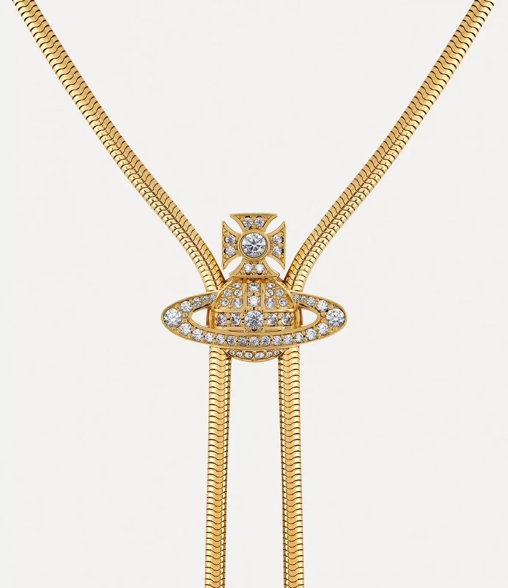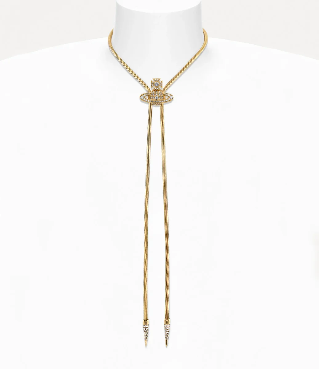 Our gold-toned Bolo tie is inspired by the house’s signature orb motif, featuring pavé crystal detailing. Crafted with a sleek snake chain and pointed crystal tips, the design can be adjusted to different lengths by sliding the orb centrepiece for a personalised fit.