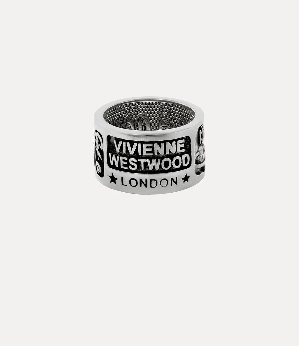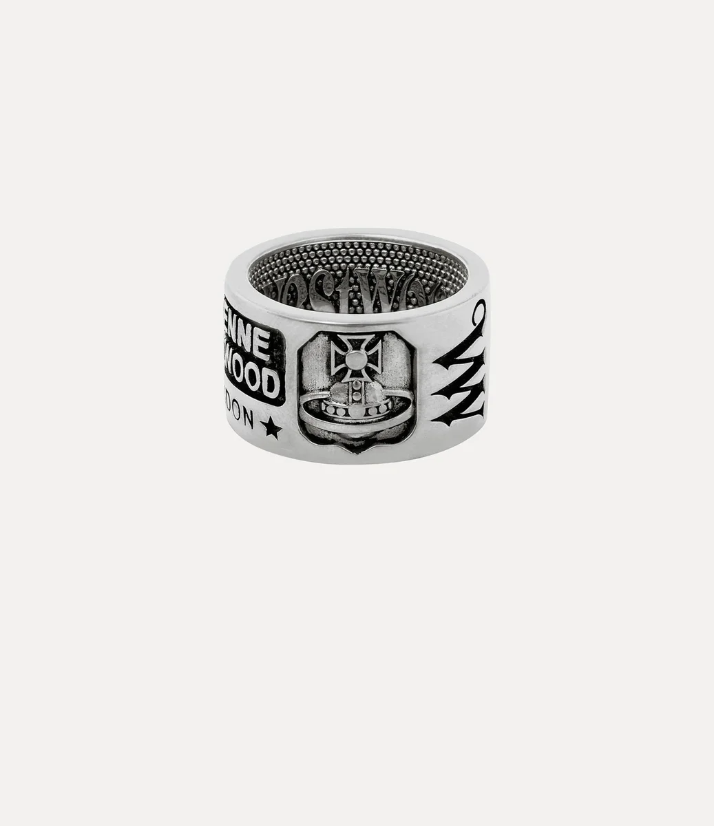 The Lancelot ring, crafted from platinum-plated recycled silver, is inscribed with signature phrases and motifs inspired by the house’s history. The wide statement band is finished with antique-effect detailing, while the inner band features an embossed ‘Vivienne Westwood’ inscription in the signature lettering.