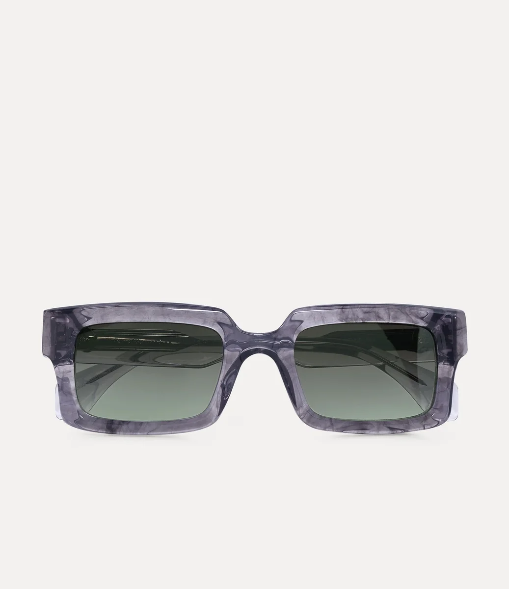 The Costello sunglasses are characterised by a bold and timeless aesthetic, inspired by the legendary cultural figures of stage and screen. Featuring square-shaped frames with graduating lenses, the design is finished in a grey marble-effect acetate, adorned with polished horn accents on the outer rim – a nod to Vivienne’s iconic Horn Alice band.