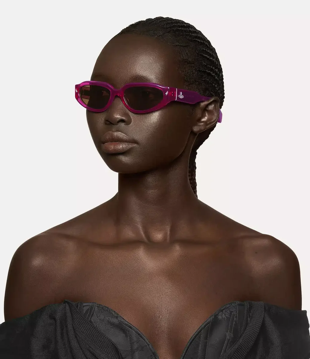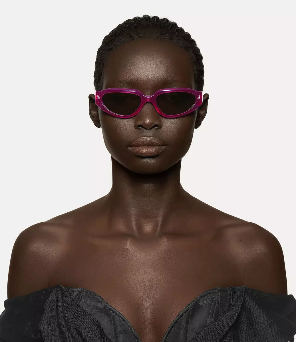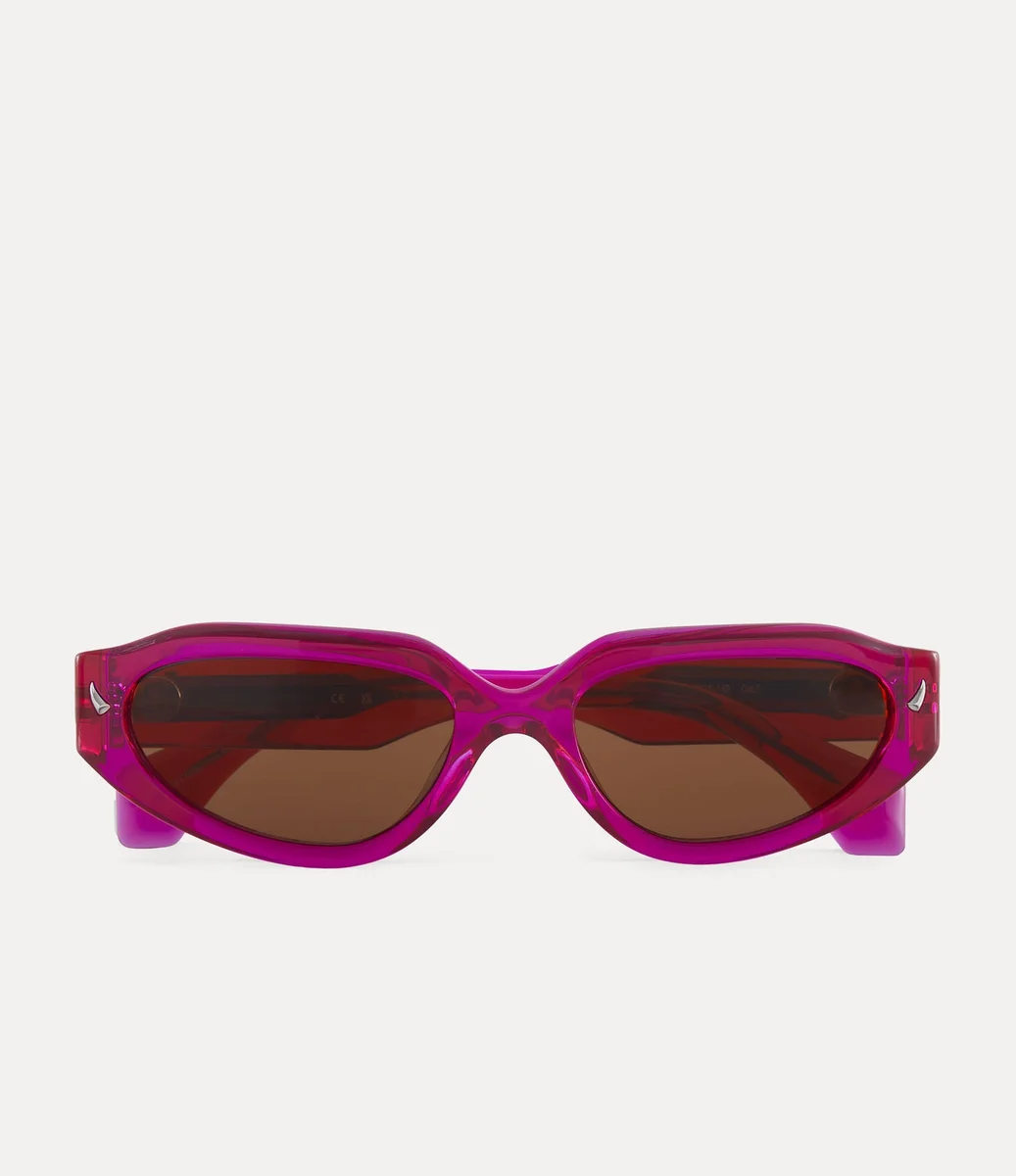 The Grace sunglasses feature a vintage-inspired oval silhouette with softly flared edges, channelling the glamour of Studio 54. Crafted in semi-transparent pink acetate with brown lenses, they’re accented by horn-shaped embellishments, echoing Vivienne’s iconic Horn Alice band.