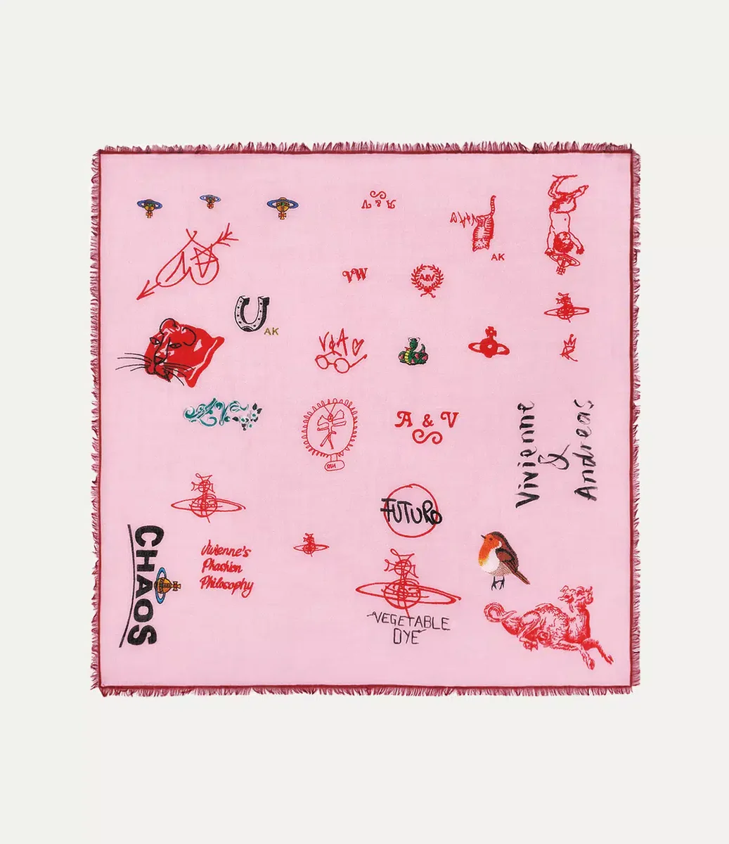 Vivienne Westwood Logos square features the ‘Patches’ artwork, celebrating iconic house symbols. The design is finished with varied signature orb motifs.