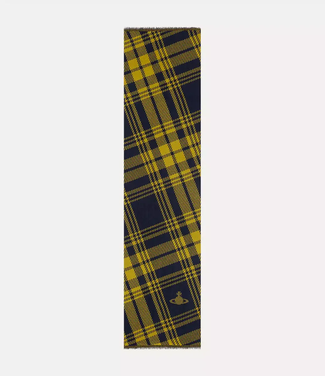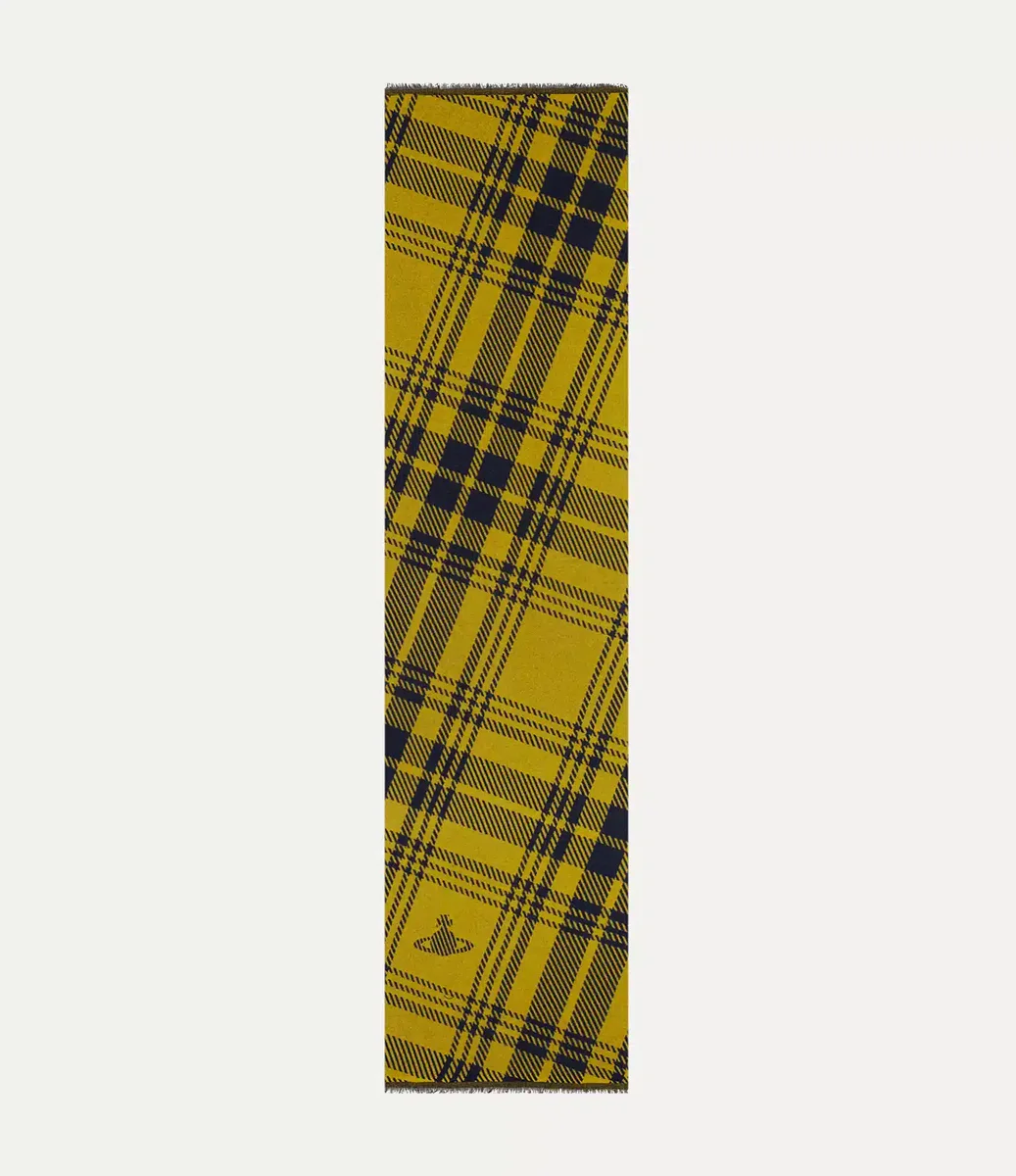 Our scarf is crafted from soft wool and woven with a tartan motif, inspired by traditional Scottish Highland regalia. Cut to a classic rectangular shape, the piece is finished with lightly fringed edges and the house’s ‘Silhouette Orb’ emblem.