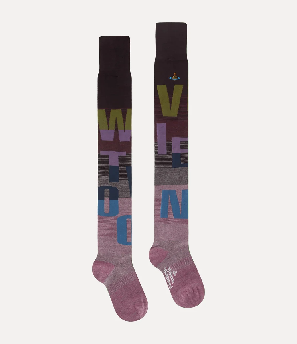 Vivienne Westwood Over The Knee socks in an extra-fine merino wool-blend features an over the knee fit and receives the ‘Logomania’ jacquard and orb embroidery.