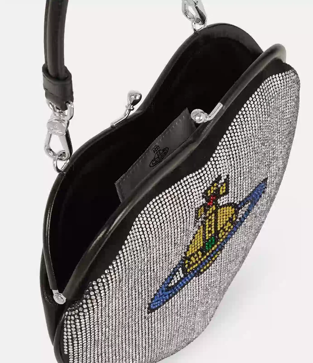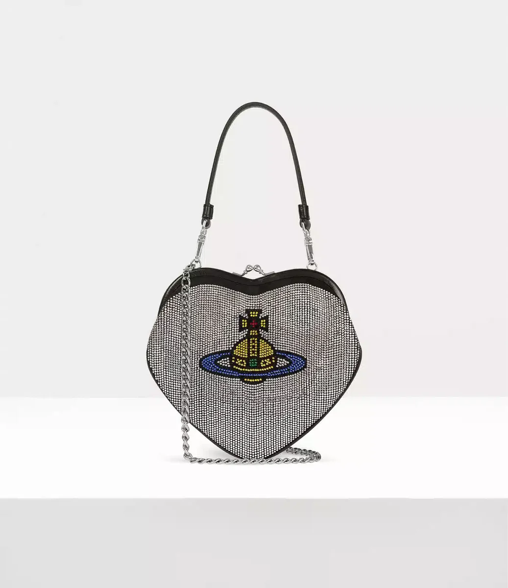 Vivienne Westwood Belle Heart Frame purse features a heart-shaped silhouette, which is embellished with rows of shimmering diamanté gemstones.