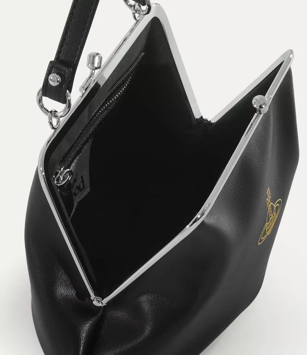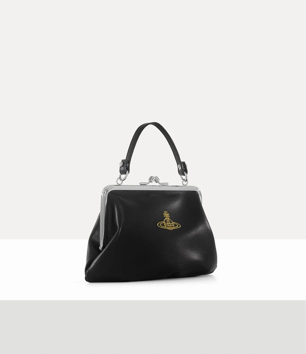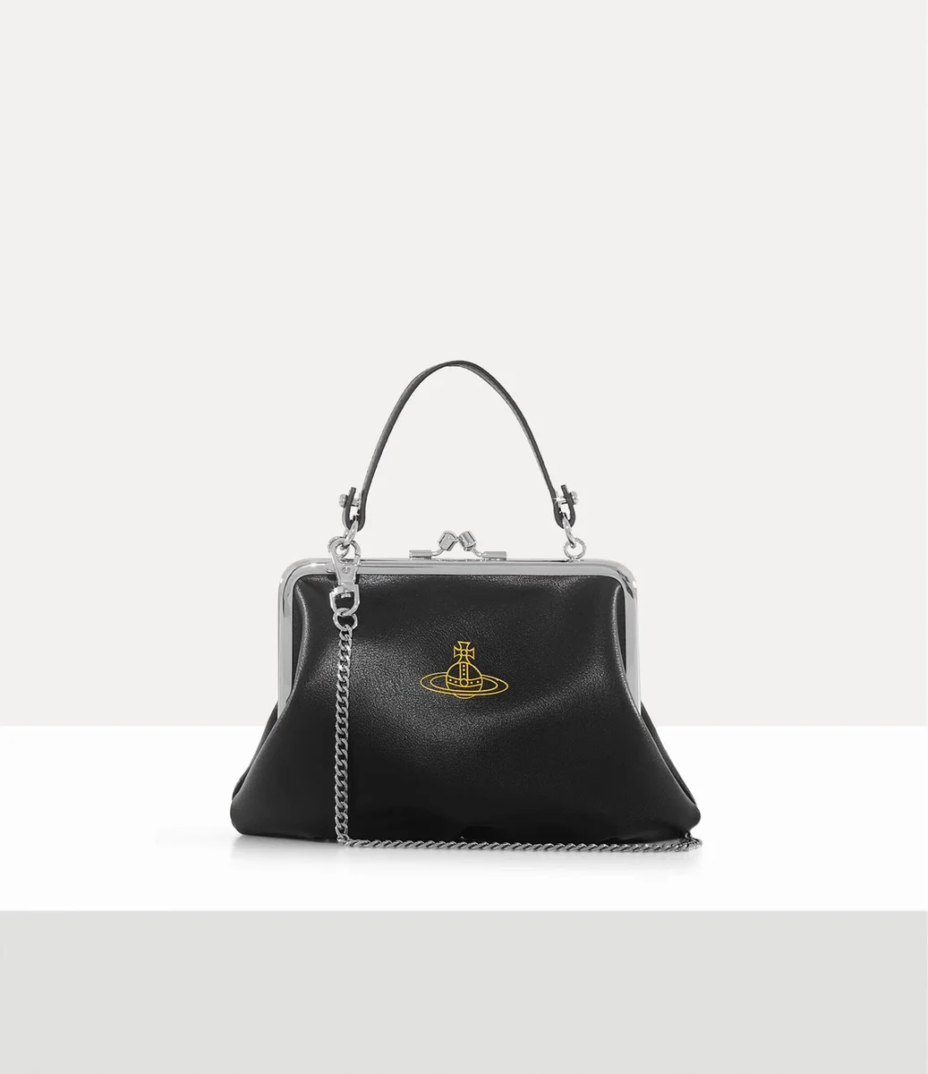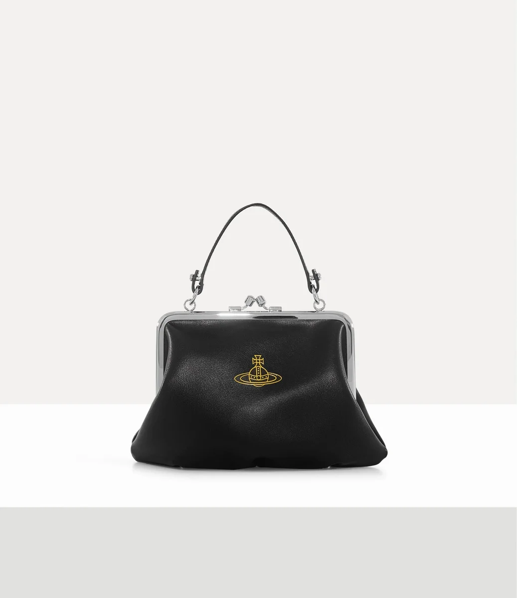The design of the Granny Frame purse references early 20th-century coin purses, offering an exposed polished framework and a kiss-lock clasp, complete with a grain-embossed finish. At the centre sits a yellow printed orb motif, referencing the house’s 1984 ‘Hypnos’ collection.