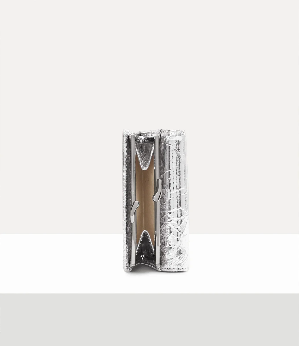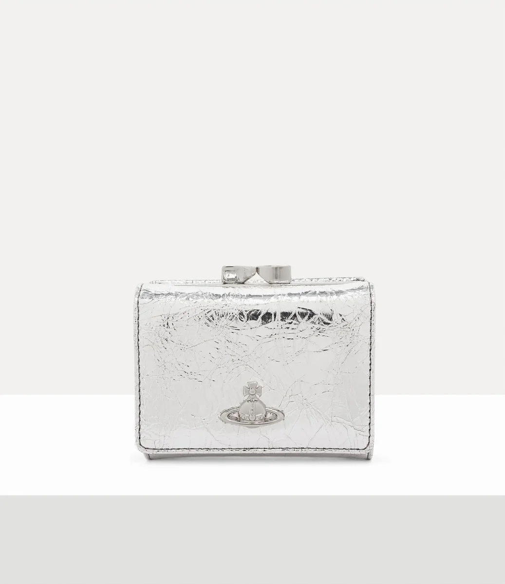 Vivienne Westwood Small Frame wallet features a metallic crinkle-effect leather design and organised interior, finished with a metal orb motif on the front.