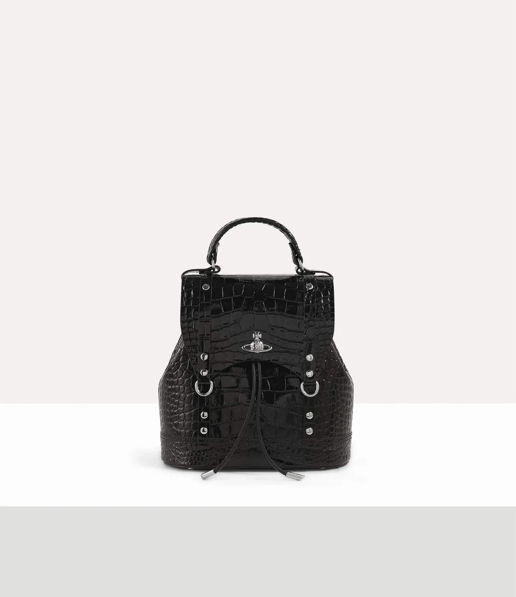 Our signature Max Small backpack is offered in a croc-effect embossed leather finish, complete with a patent texture – reminiscent of the liquid latex and rubberwear sold in our iconic Sex boutique. The piece features bondage-inspired elements, reminiscent of our ‘Erotic Zones’ collection from Spring-Summer 1995.