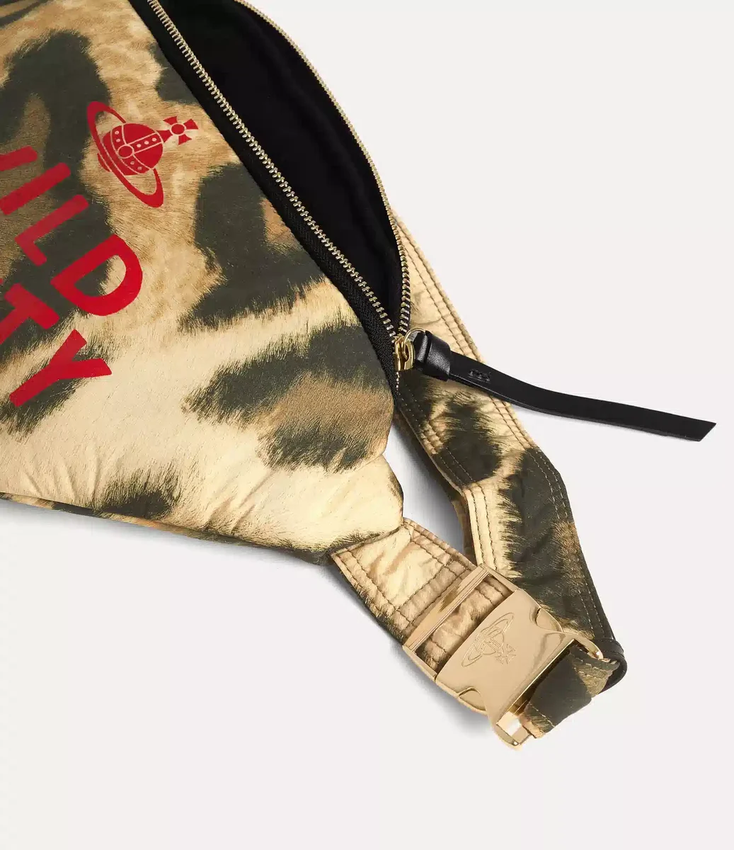 Our Ada body bag offers a crescent-shaped nylon profile, printed with a bold leopard motif that nods to our Autumn-Winter 2001 Gold Label collection, ‘Wild Beauty’. Printed across the front, the orb emblem sits above the slogan ‘Wild Beauty’ in vivid red, while a secure top-zip fastening, and adjustable strap complete the design.