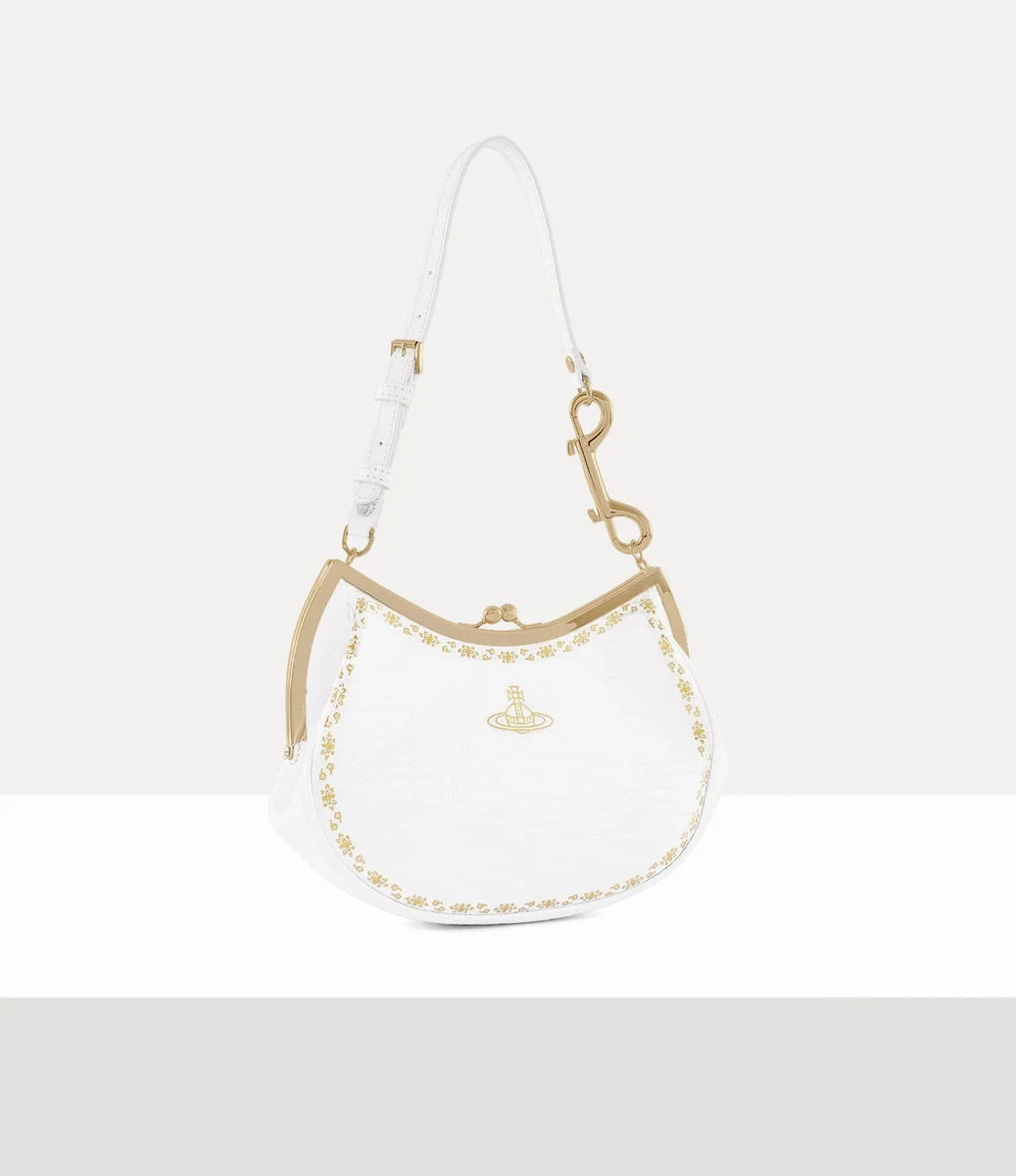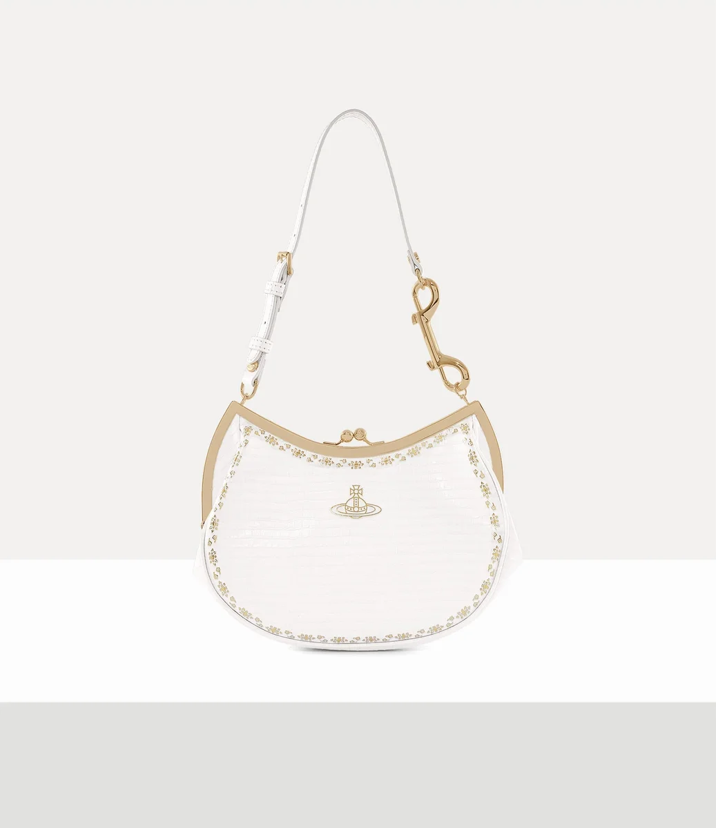 Vivienne Westwood Charm Frame purse in leather features a crescent silhouette, with a subtle mini croc-effect texture, finished with gold foil embossing.