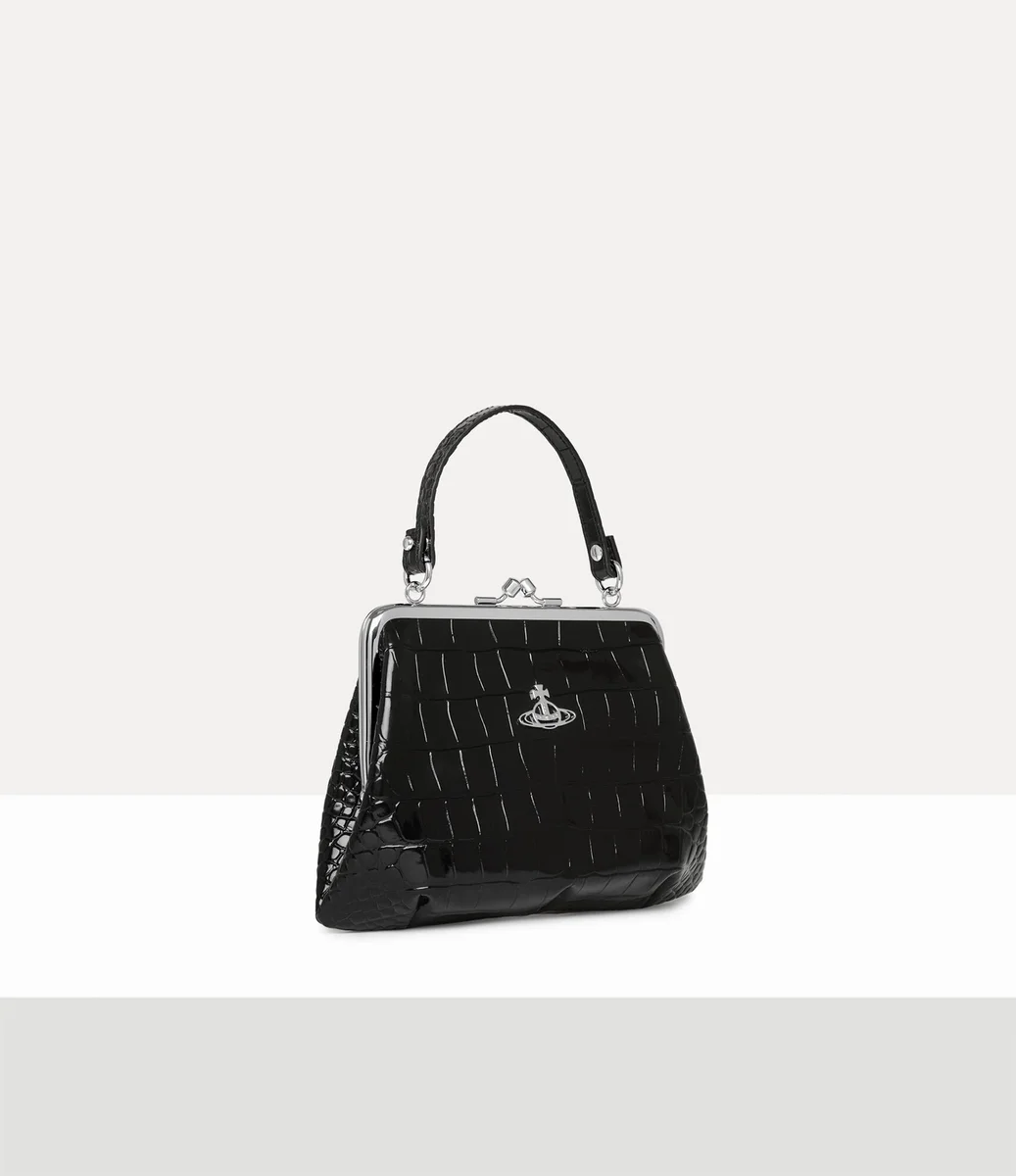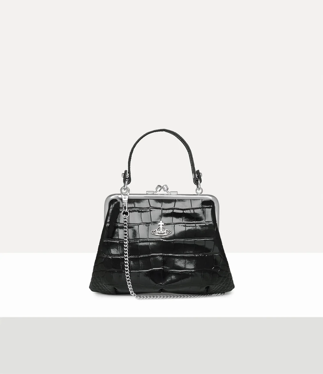 The silhouette of the Granny Frame purse is reminiscent of antique coin purses from the early 20th century, featuring a metal framework with a secure kiss-lock closure. The piece offers croc-effect embossing across the design, complete with our classic line orb motif on the front panel, synonymous with the house’s ethos of launching the past into the future.