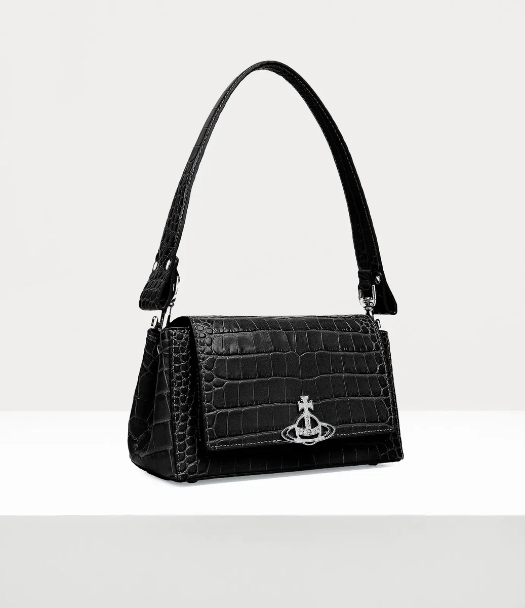The croc-embossed Hazel Medium handbag features a ‘soft punk’ inspired baguette silhouette and opens to reveal the broken pinstripe lining and vanity mirror. The front flap closure showcases our house’s orb motif, embodying Vivienne Westwood’s vision of blending the past with the future.
