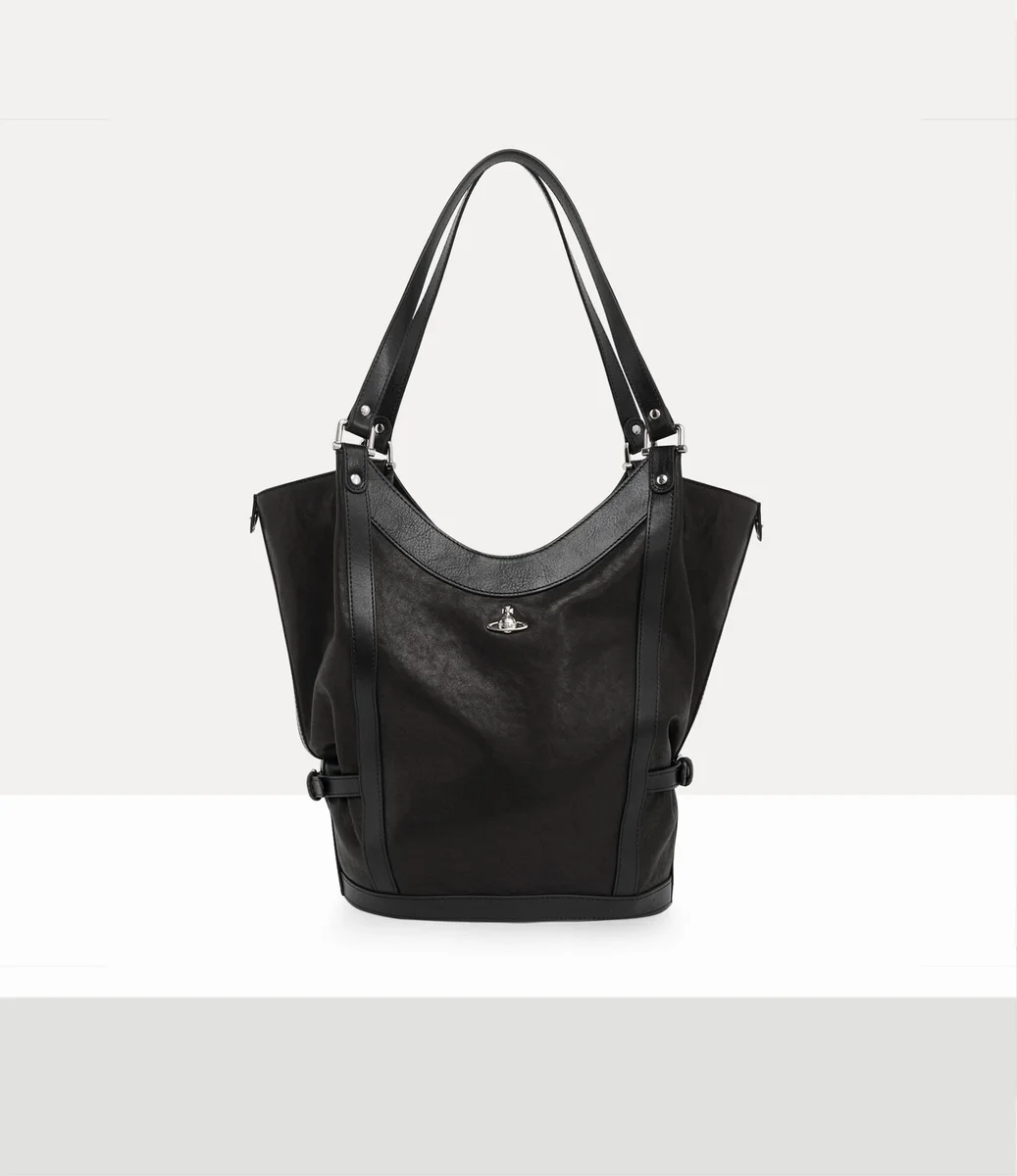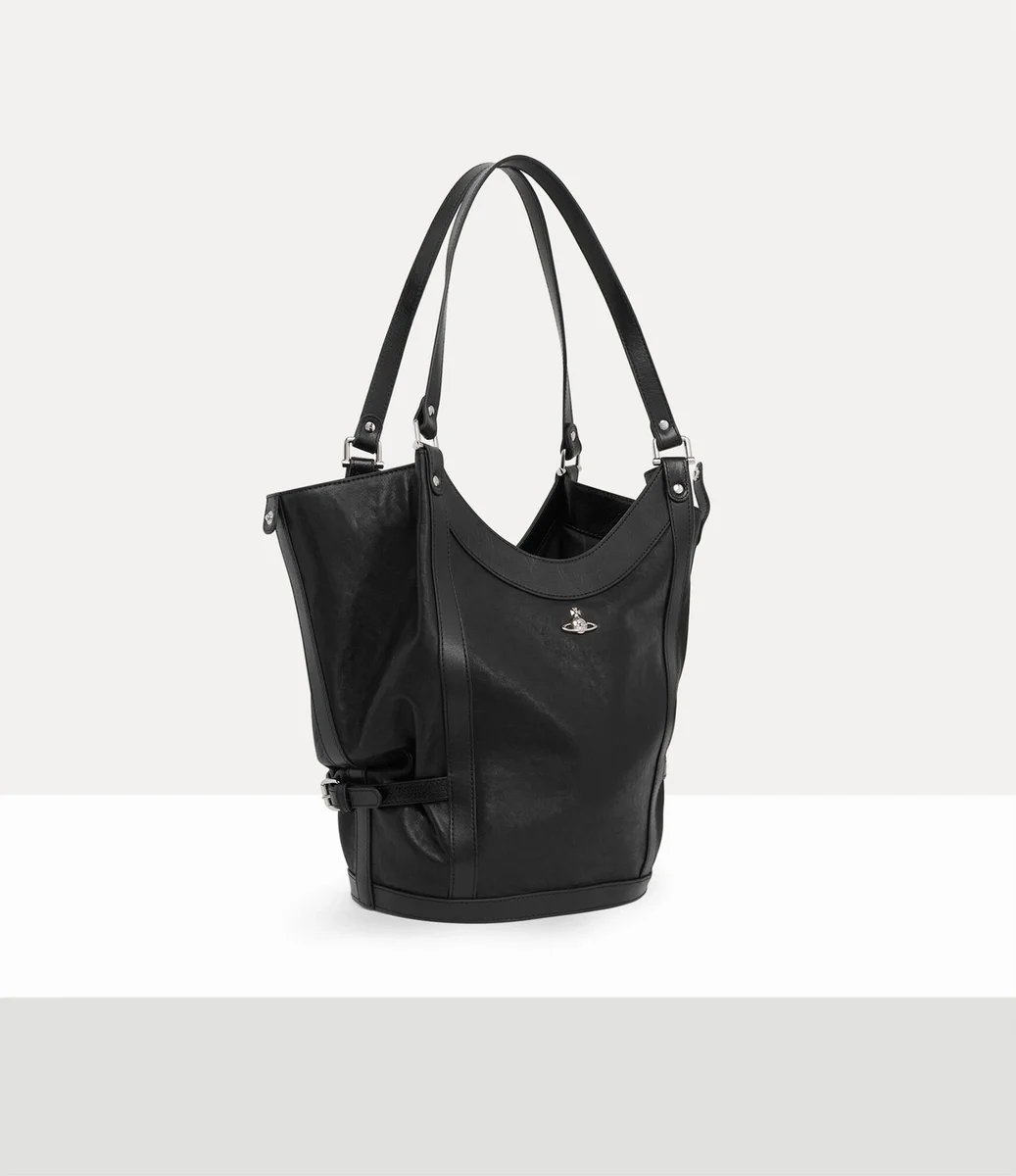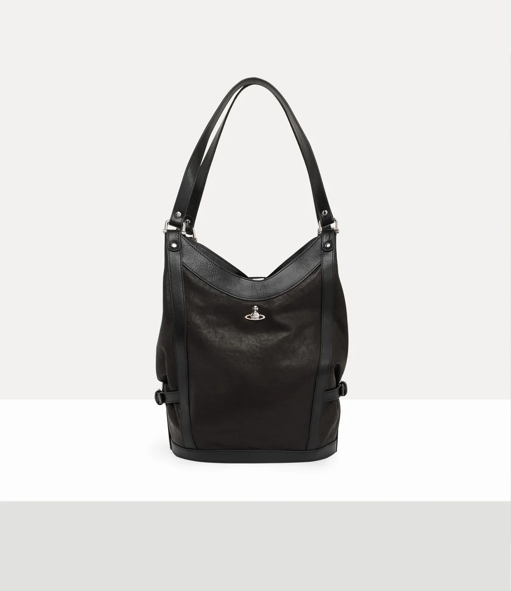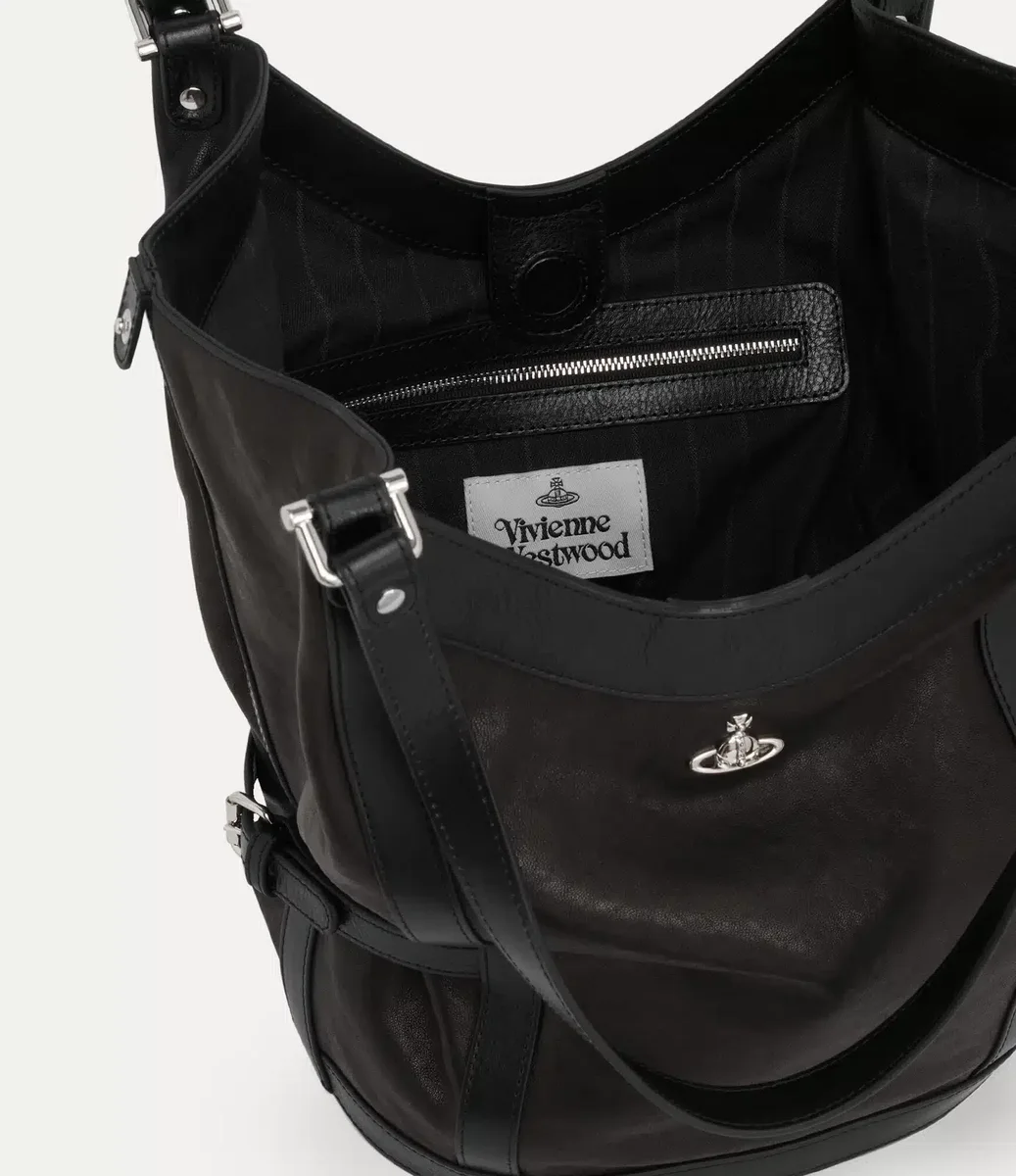 The Olive Large Shoulder Bag is crafted from supple leather and lined with our signature ‘Broken Pinstripe’ pattern, first introduced in Vivienne’s Gold Label Autumn–Winter 2015 collection. Designed with a soft, slouchy silhouette, the piece is detailed with bondage-style straps that cinch the form like a harness.