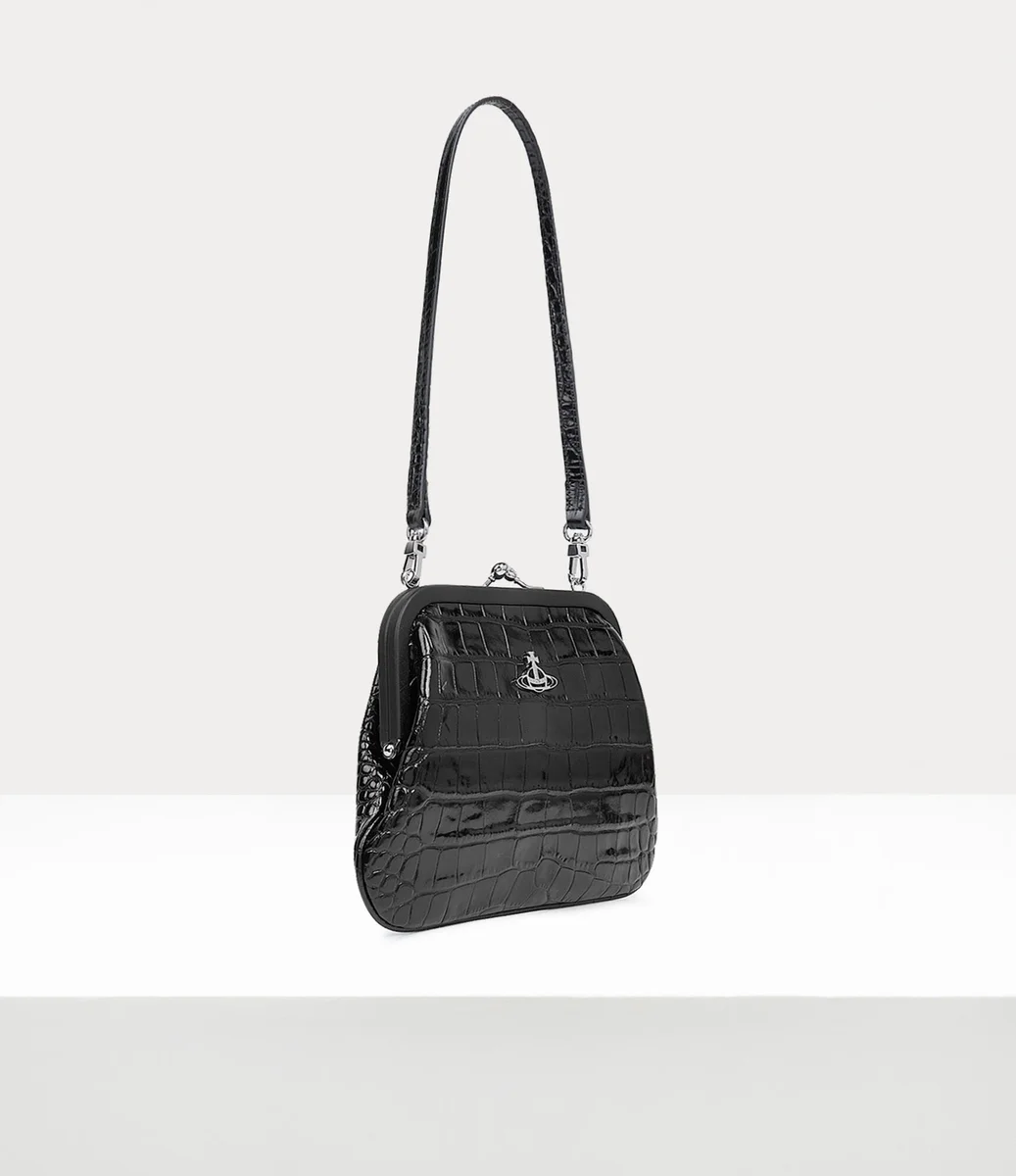 Vivienne Westwood Vivienne’s clutch is offered in a shiny leather finish, featuring a vintage-inspired kiss-lock frame and croc-effect embossing.