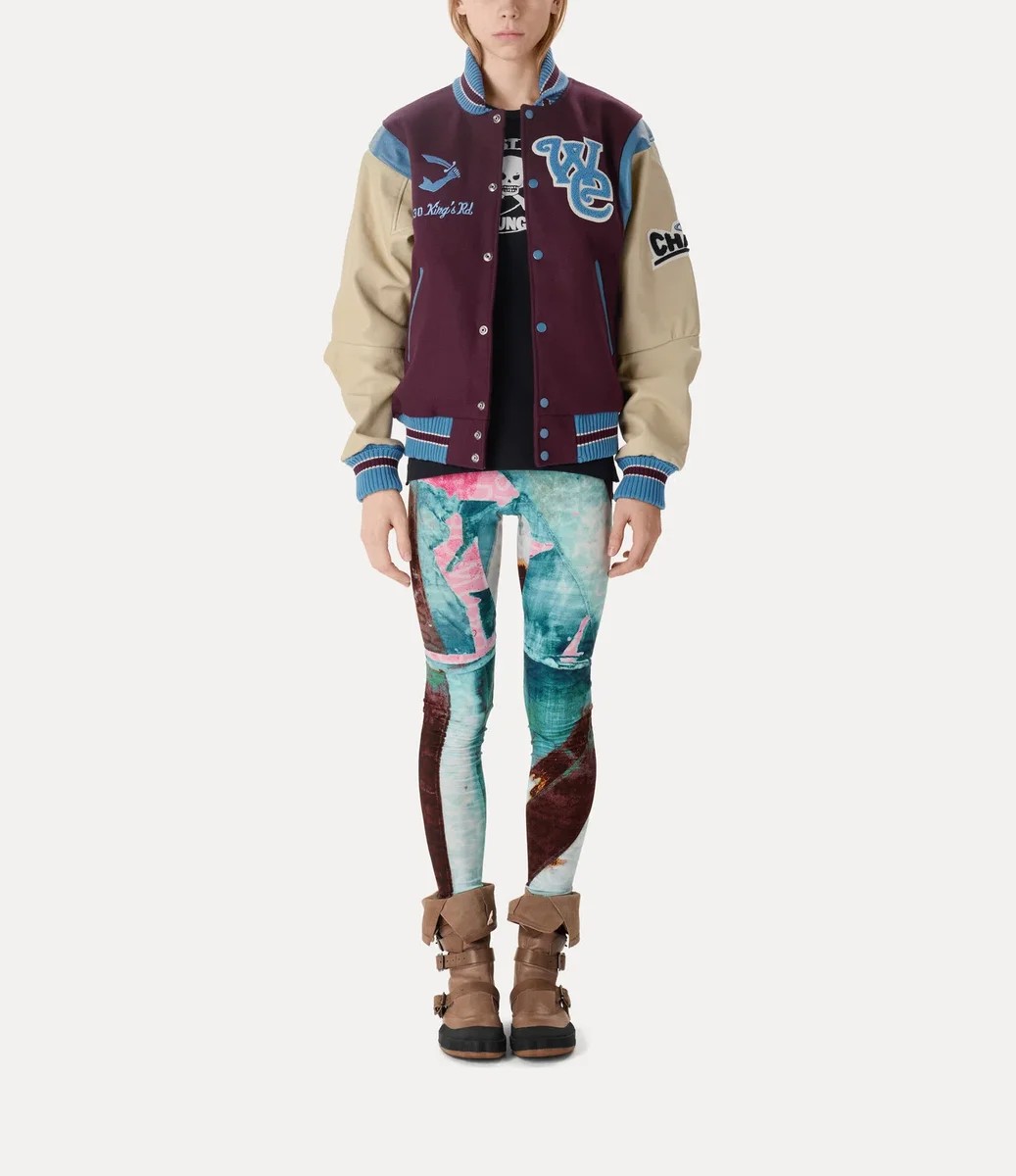 Vivienne Westwood Worlds End Letterman jacket features a bomber-inspired silhouette, detailed with leather sleeves.