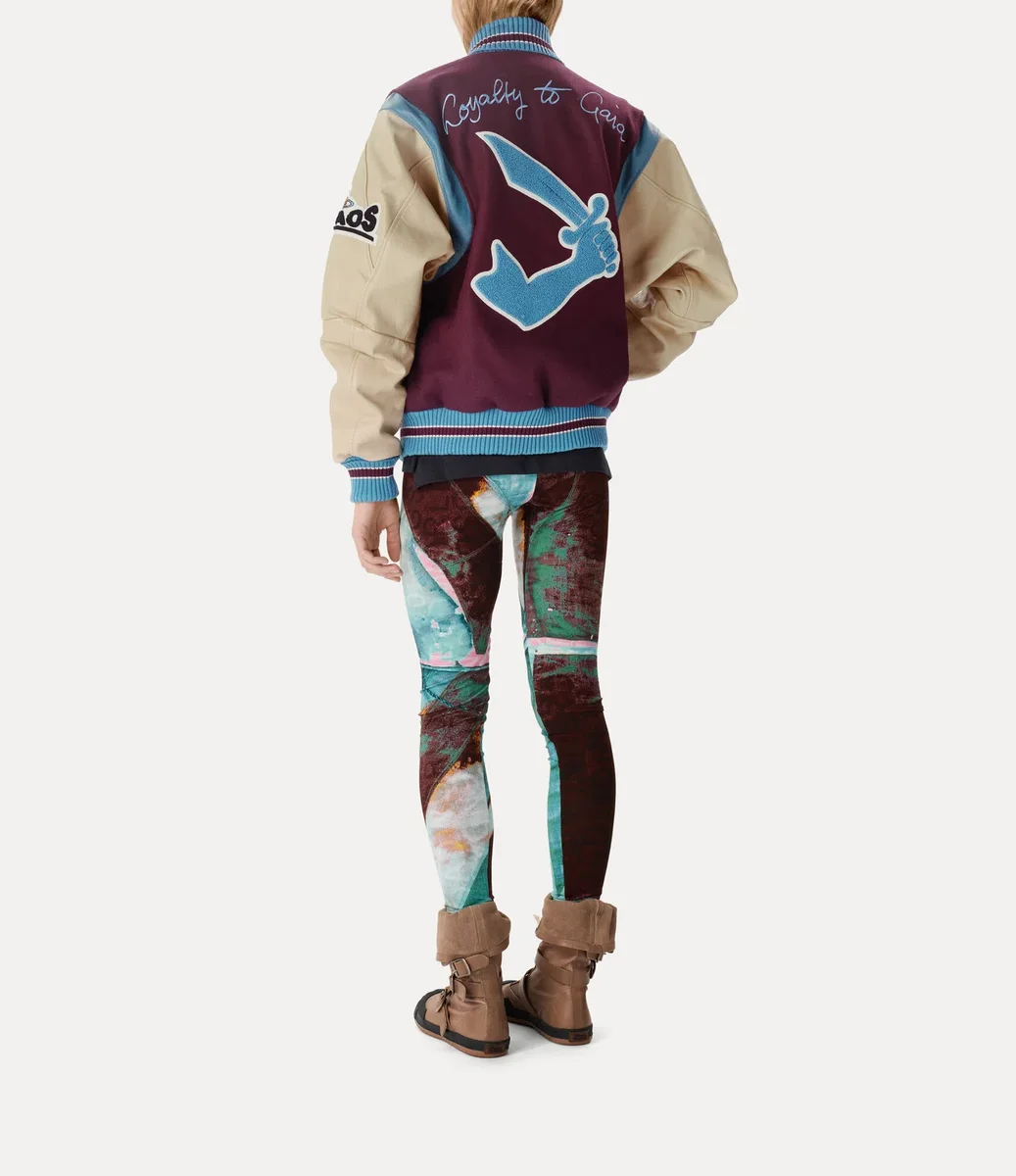 Our Worlds End Letterman jacket features a bomber-inspired silhouette, detailed with leather sleeves and contrasting ribbed trims. The front is adorned with an arm and cutlass motif and the address of our Worlds End boutique, while the reverse offers the phrase ‘Loyalty to Gaia’ – a nod to Vivienne’s commitment to climate activism.