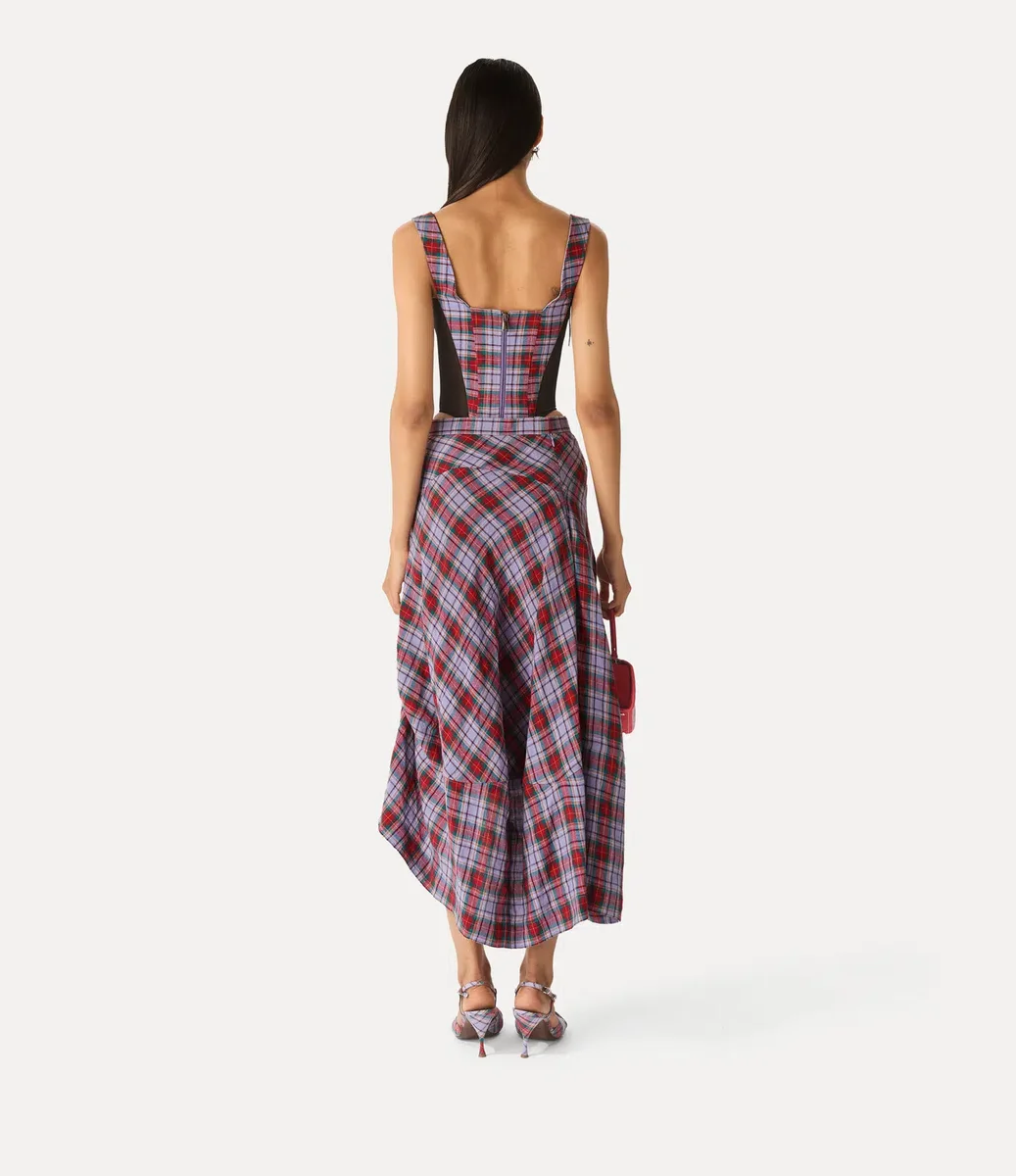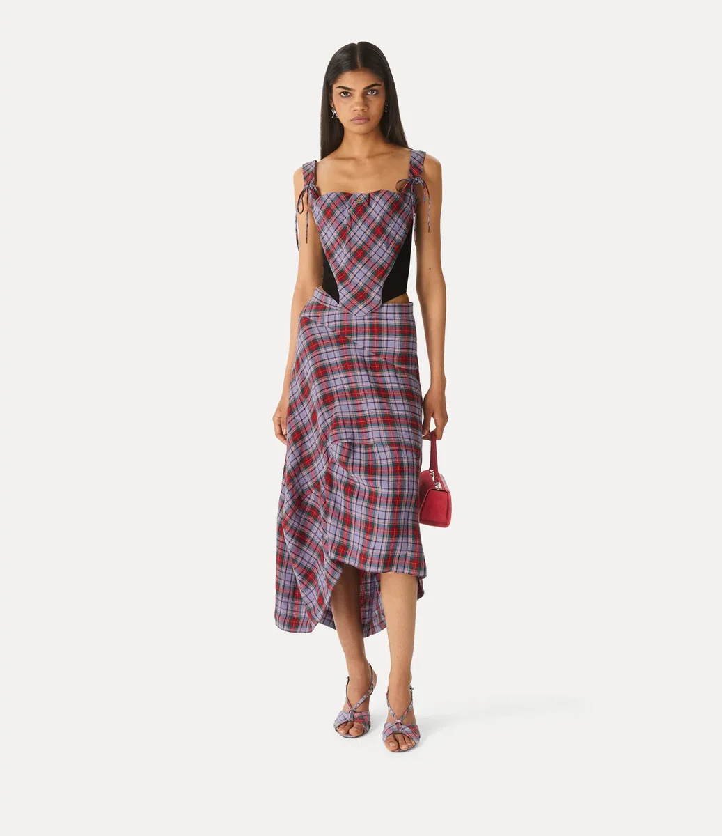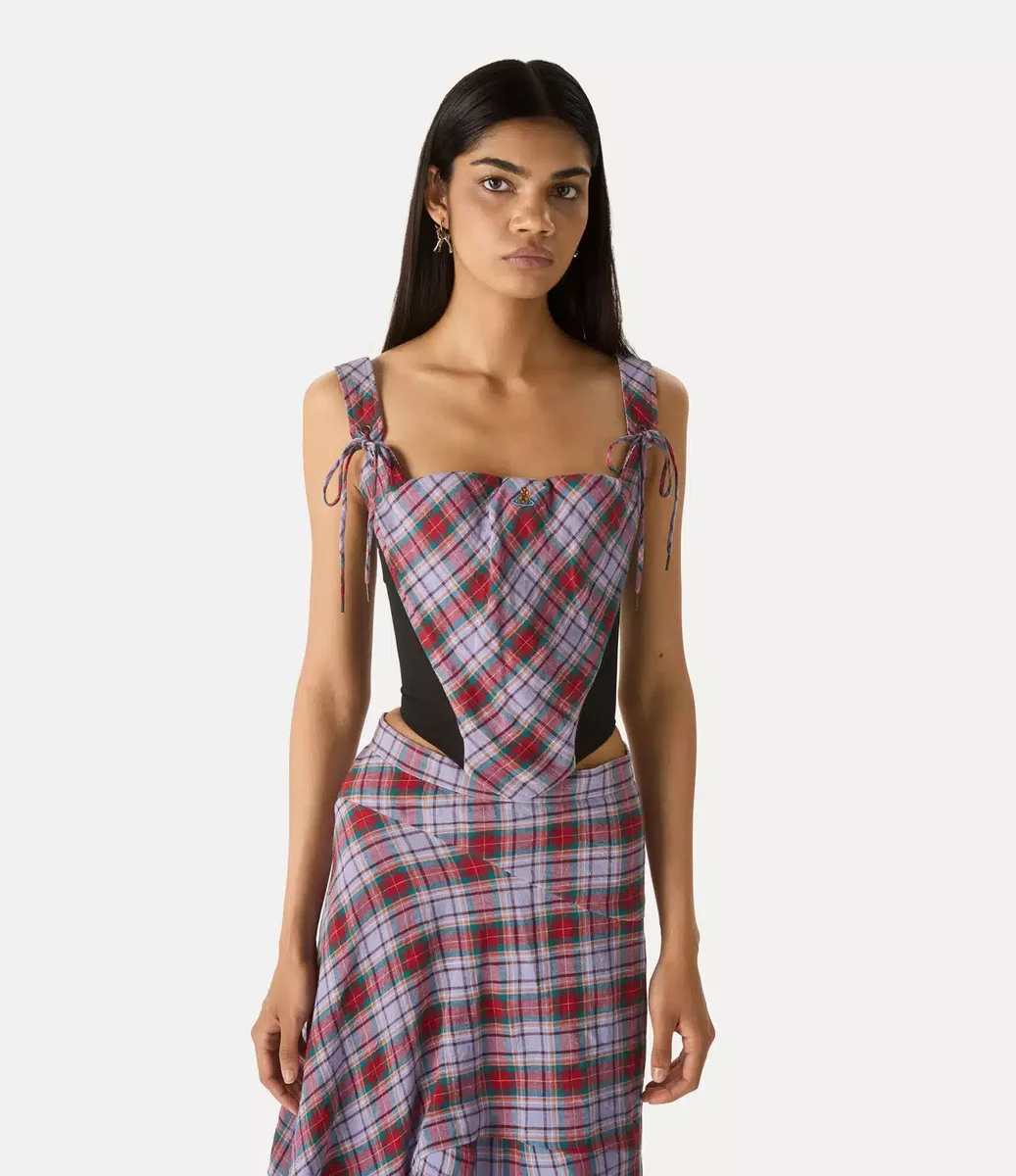 Vivienne Westwood Puppy corset is reimagined this season in the ‘Louth Tartan’ linen motif, woven in red, green and purple hues.