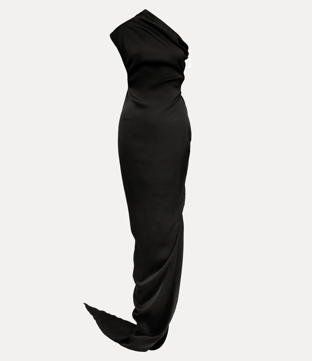 Our Andreas dress is defined by its sweeping one-shoulder neckline, sculpting the form with a fitted bodice and delicate darting that traces the silhouette. Along the side, gentle ruching gathers the fabric into a soft drape, cascading into an elegant train.