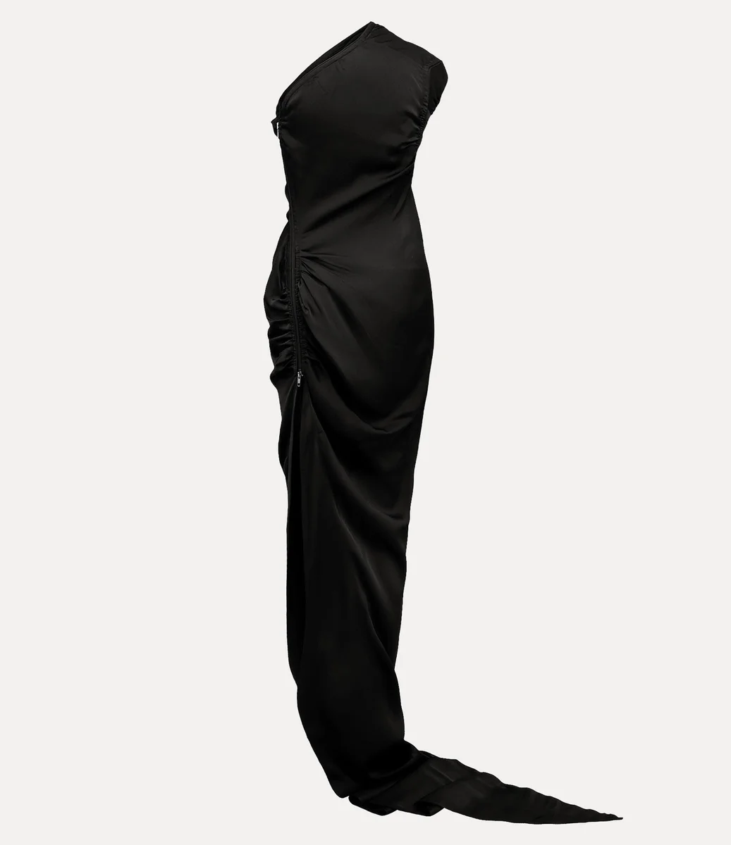 Vivienne Westwood Andreas dress features a sleeveless asymmetrical hemline, crafted with matte and satin textures, complete with a side zipper closure.