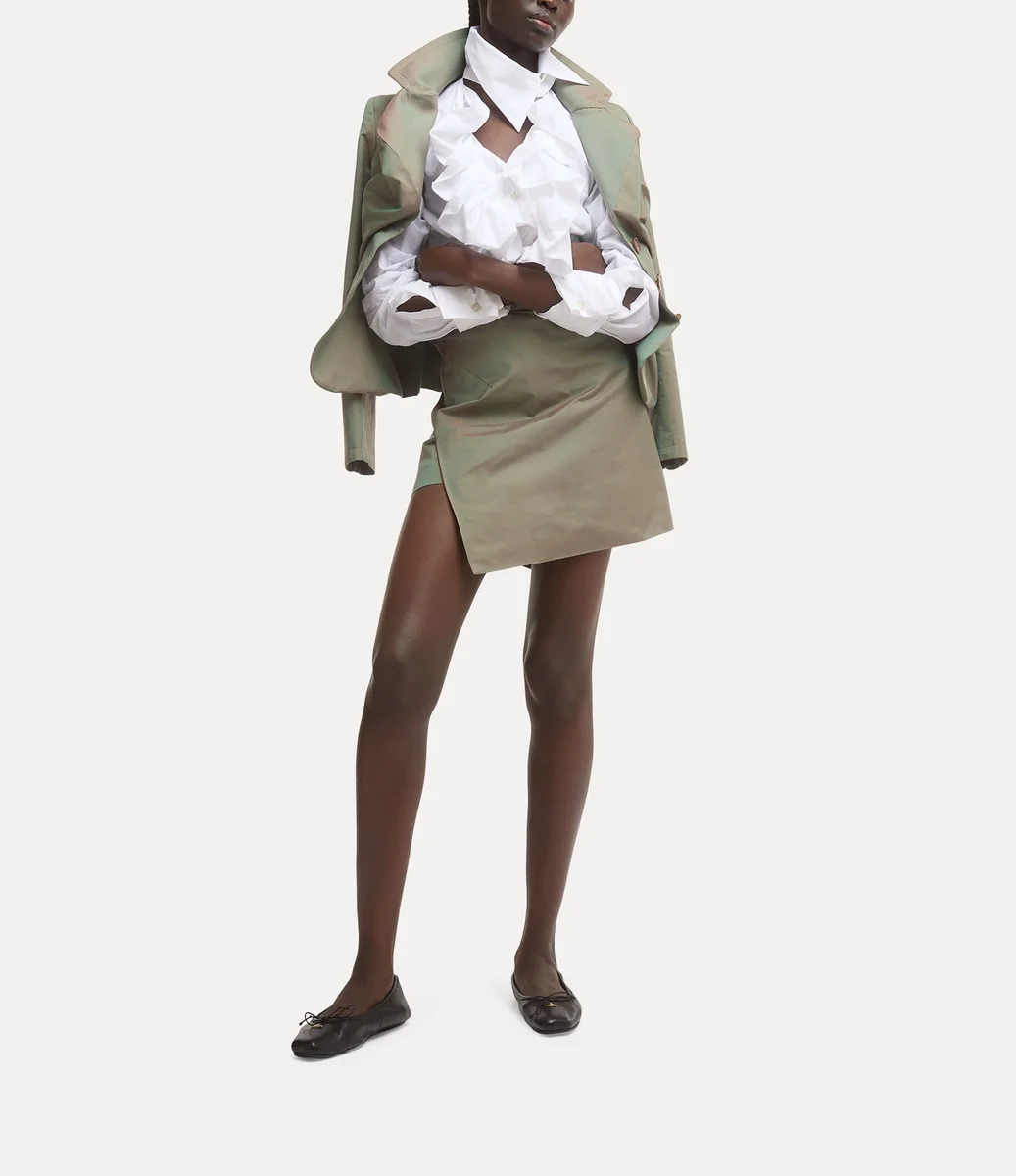 Our Mini Infinity skirt is made from a cotton blend gracefully wraps around the hips, featuring a mid-rise waistband that shapes a sleek, structured A-line silhouette with an asymmetric finish. The design fastens with a concealed zip and an amber-toned button, all in a washed sage green hue.
