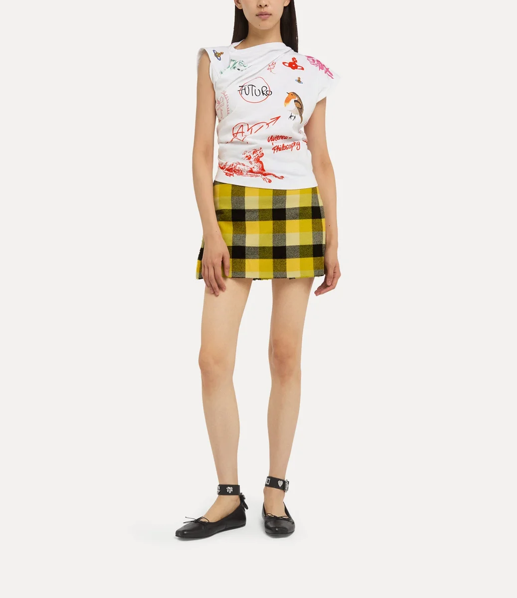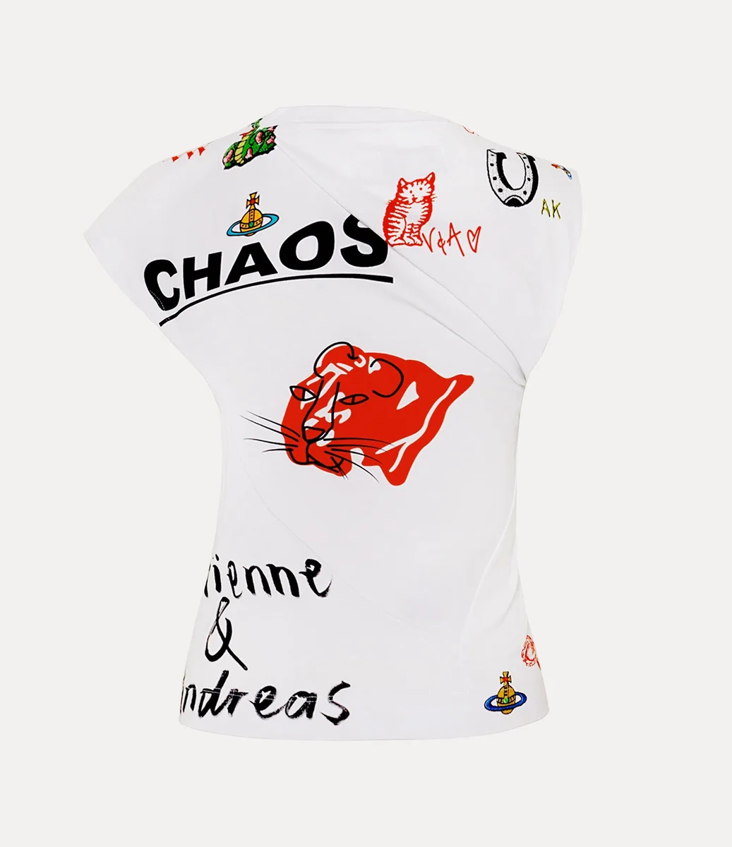 Our classic Hebo top is reimagined this season with the ‘Patches’ artwork, reviving signature iconography of the house, complete with symbols of good fortune and rebellion. The silhouette is cut with Vivienne’s slash-inspired neckline, framed by soft draping and a twisted detail at the back.