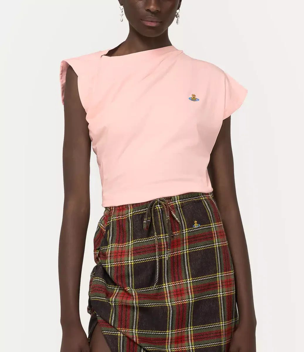 The house’s signature Hebo top has been updated, featuring a soft cotton finish this season and an orb embroidery on the left-hand side of the chest – synonymous with Vivienne’s vision of launching tradition into the future. The silhouette incorporates Vivienne’s signature slash-inspired neckline, drape details and twisted fabric at the back of the design.