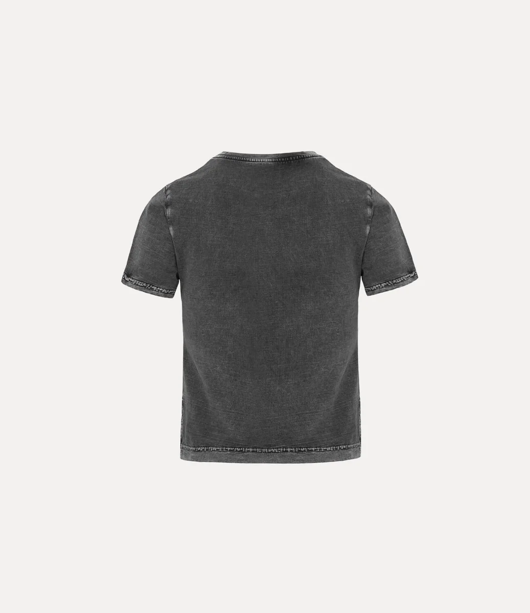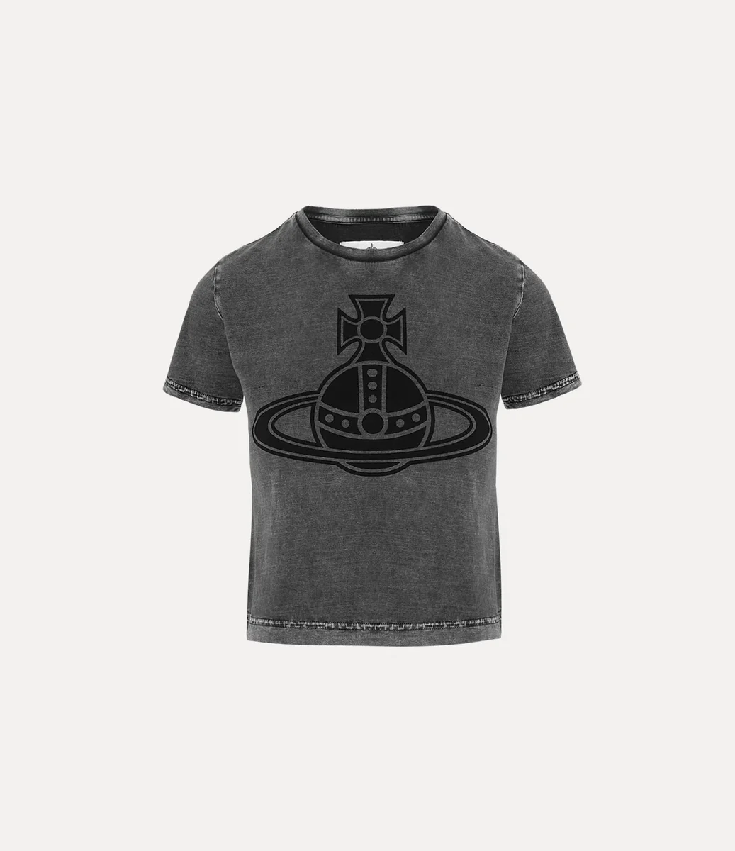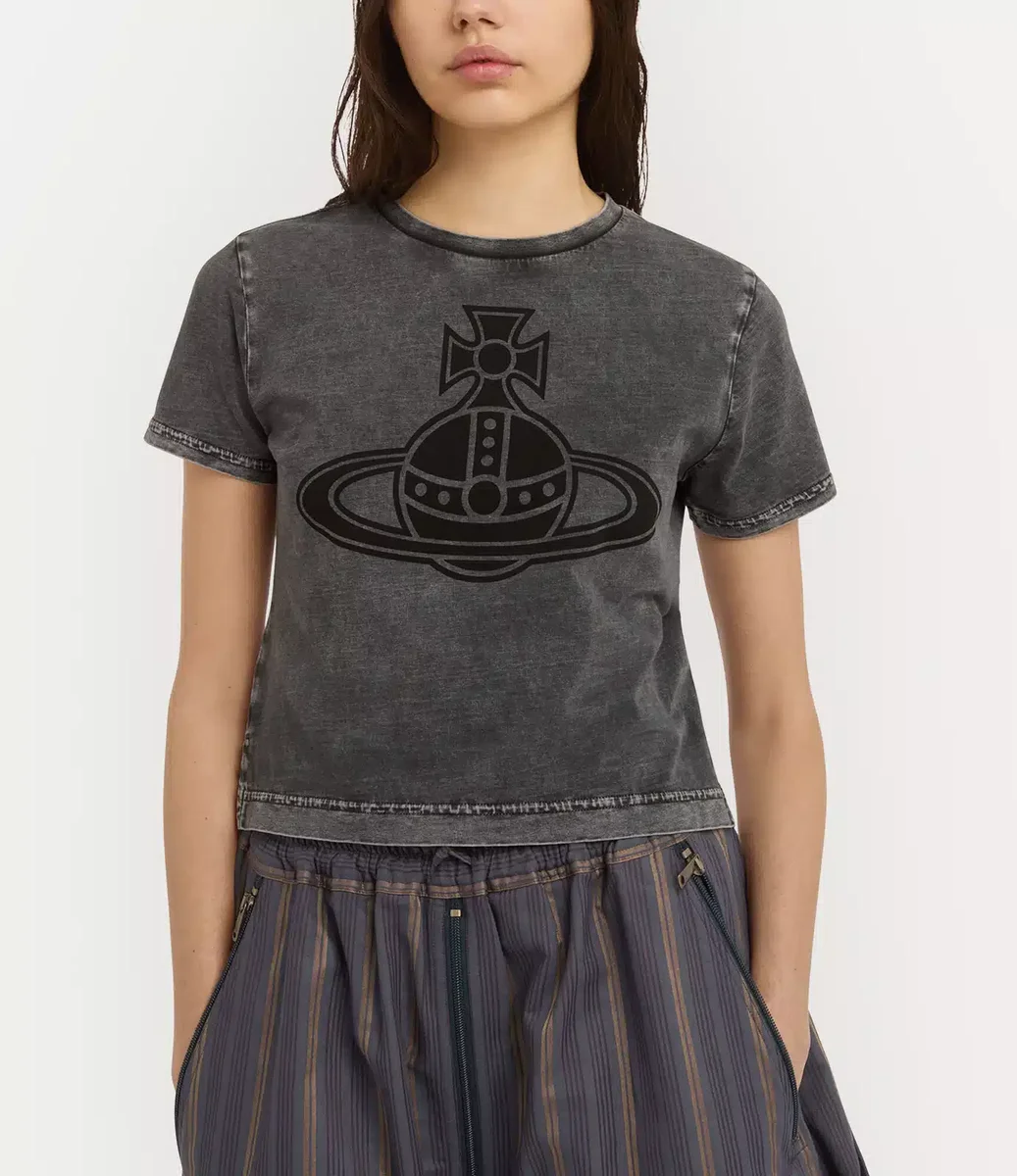 Our Paris Orb Mini Peru t-shirt is crafted from lightweight cotton jersey, shaped into a cropped silhouette with a classic crew neckline that flows into an asymmetric stepped hem. Adorned with the house’s orb motif, the piece echoes Vivienne’s vision of propelling tradition into the future.