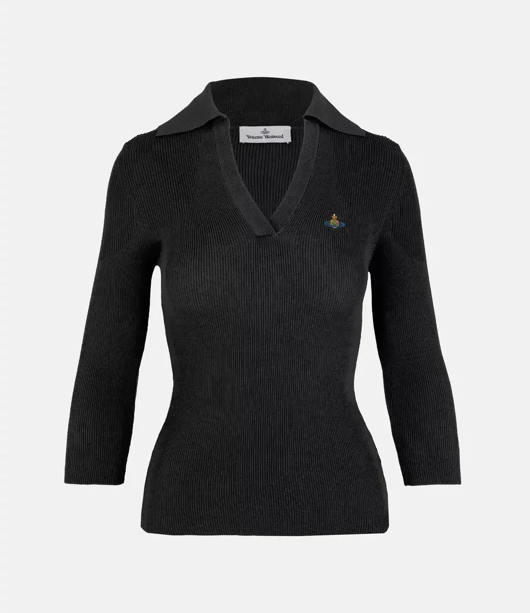 Our Marina polo sweater features a fitted silhouette, complete with a polo-inspired collar and three-quarter length sleeves. The piece offers an all-over ribbed finish, accented with the house’s signature orb embroidery, which symbolises tradition, encircled by the celestial rings of Saturn, representing the future.