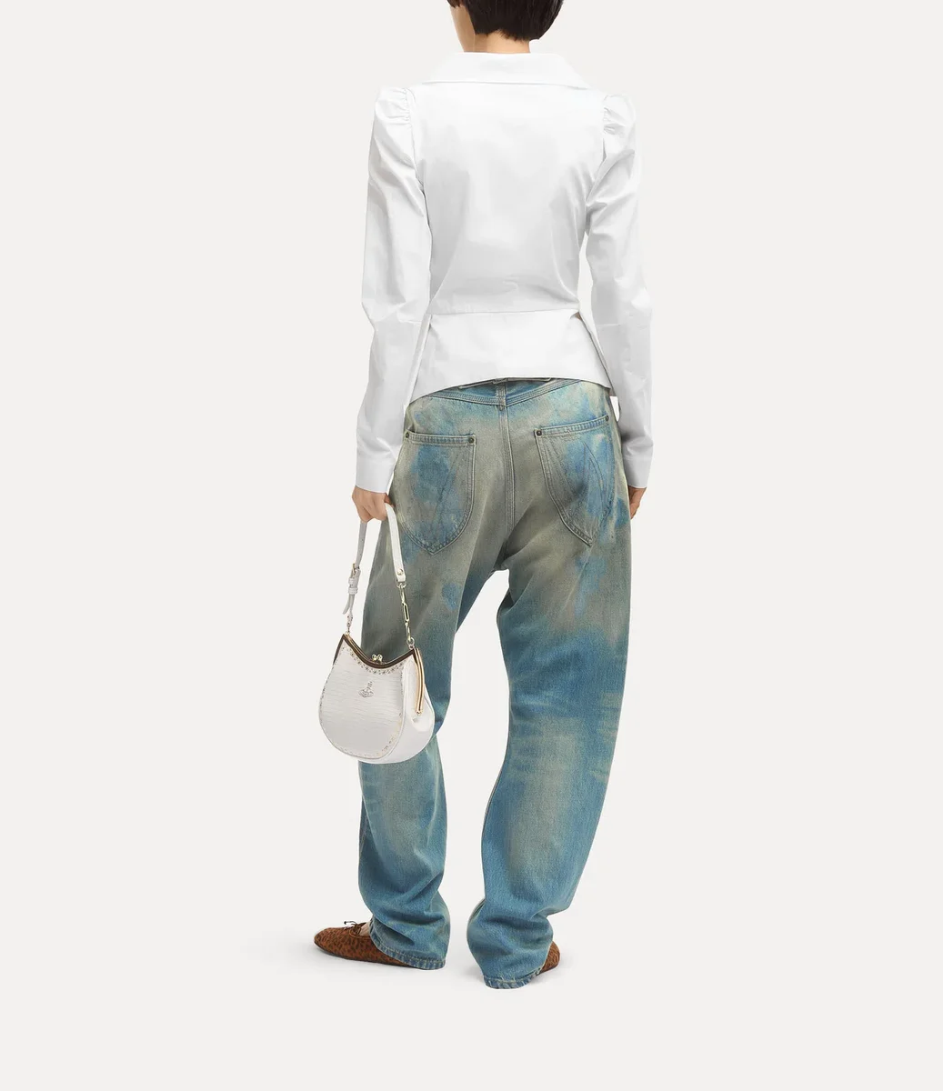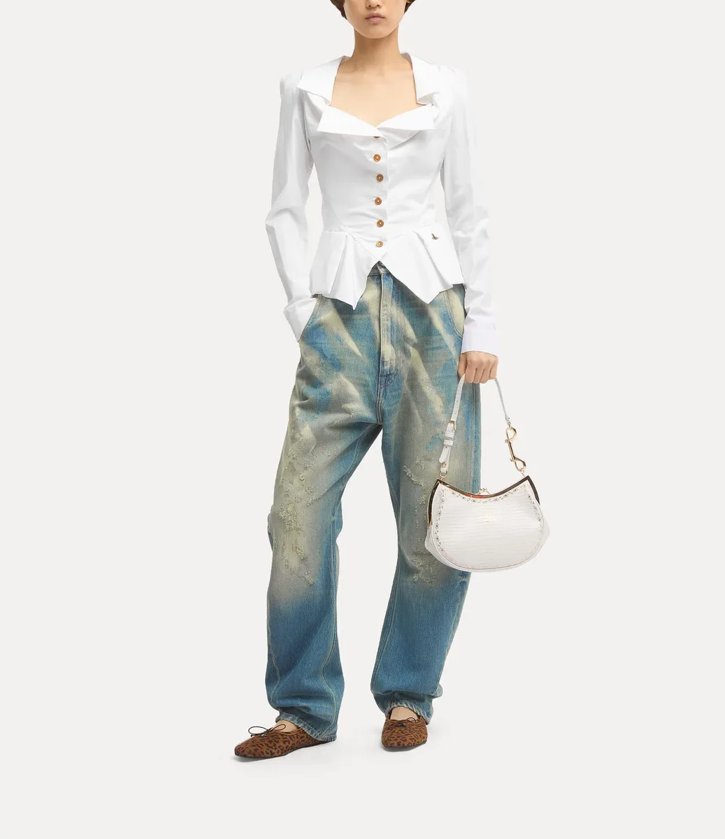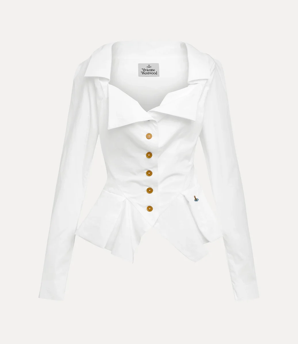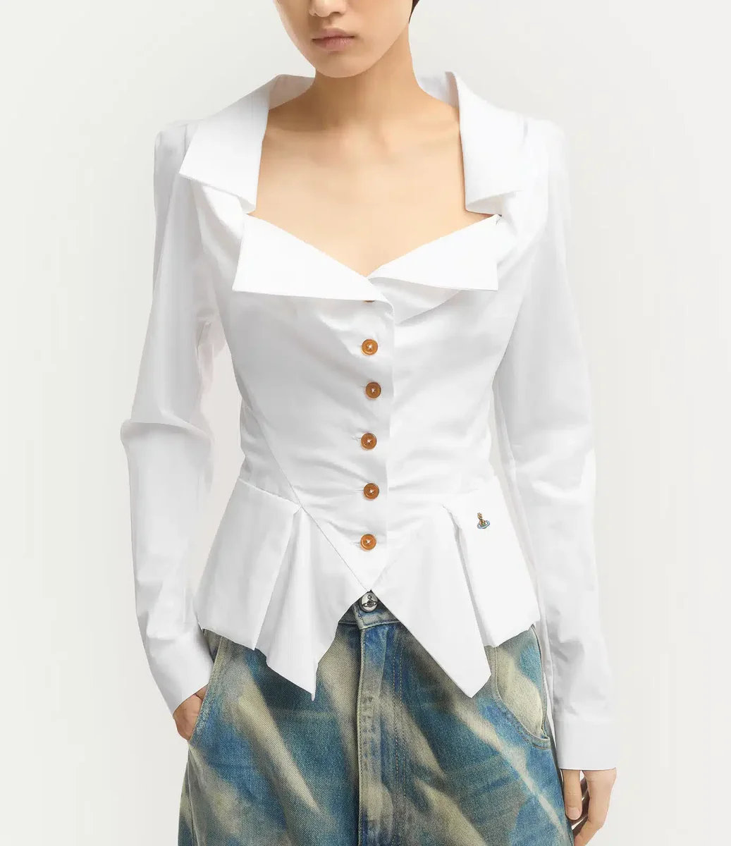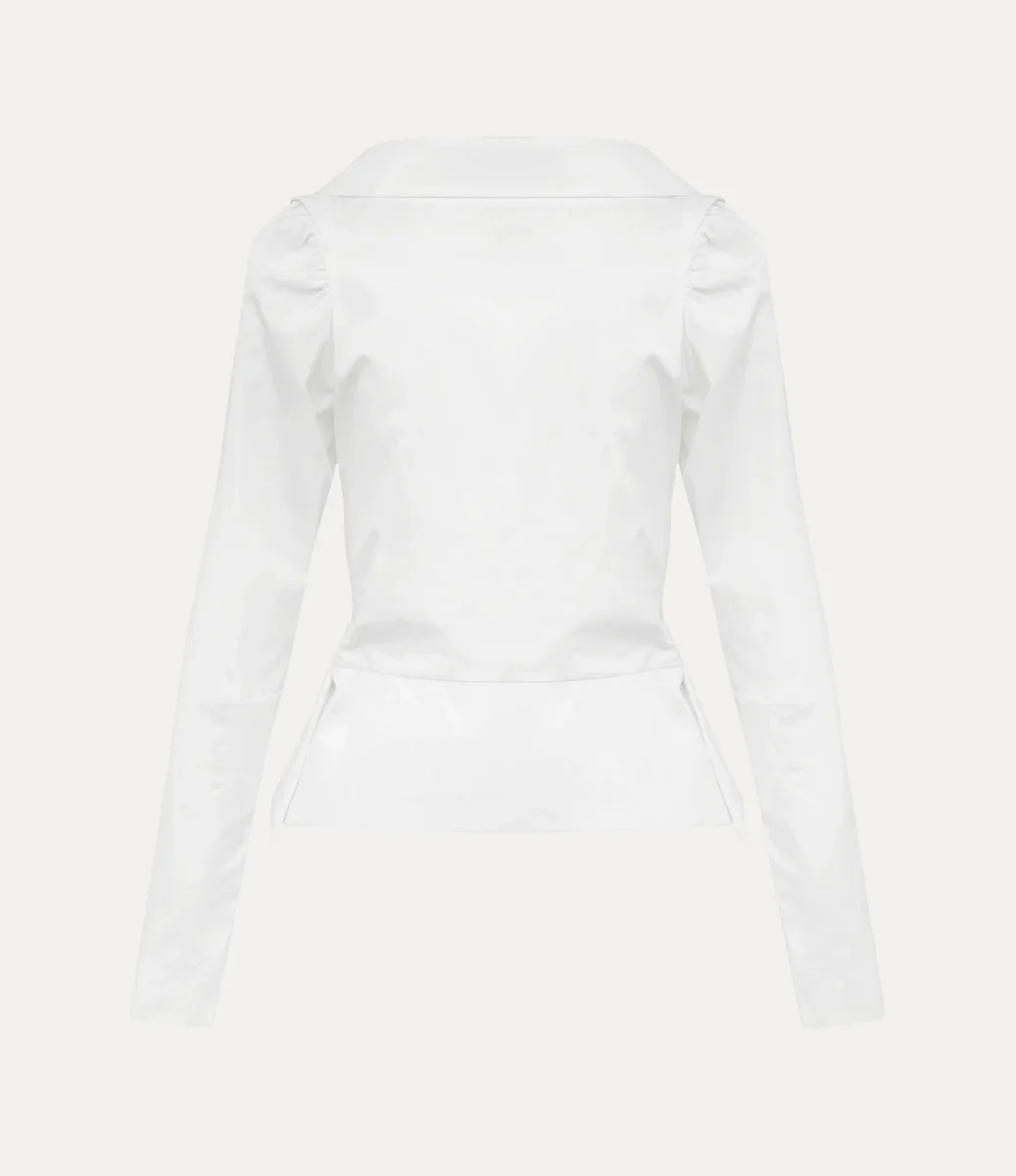 The Monday shirt offers origami-like folds of fabric around the neckline, adorned with button-front fastenings and our signature multi-coloured orb embroidery at the hip. The piece creates a silhouette inspired by the 1930s American Midwest, featuring a fitted bodice with a flared, pleated fabric extension at the waist and elegantly puffed shoulders.