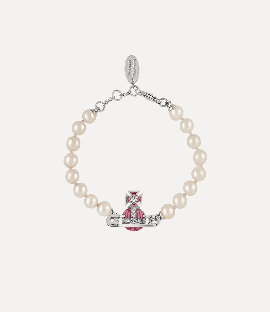 Vivienne Westwood Kitty Pearl bracelet features hand-knotted glass pearls, a safety pin motif, and a rose enamel orb, finished in silver-tone plating.