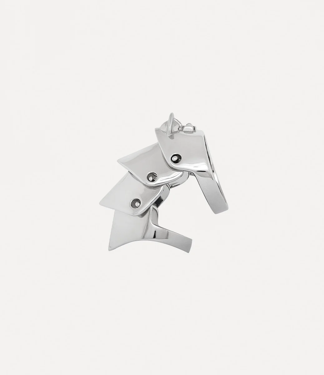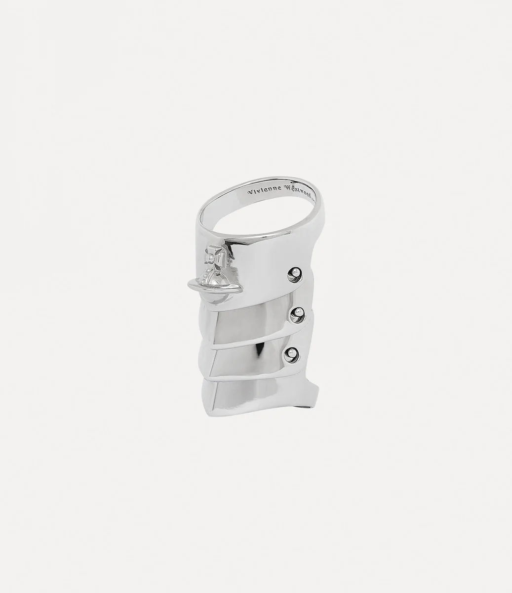 The silhouette of the Armour ring draws inspiration from the plated, armour-inspired jackets from the Vivienne Westwood ‘Time Machine’ collection from 1988 – reflecting Vivienne’s deep fascination with the Wallace Collection. The piece features four platinum-plated silver sections that overlap, adorned with our signature orb motif – embodying the ethos of taking the past into the future.