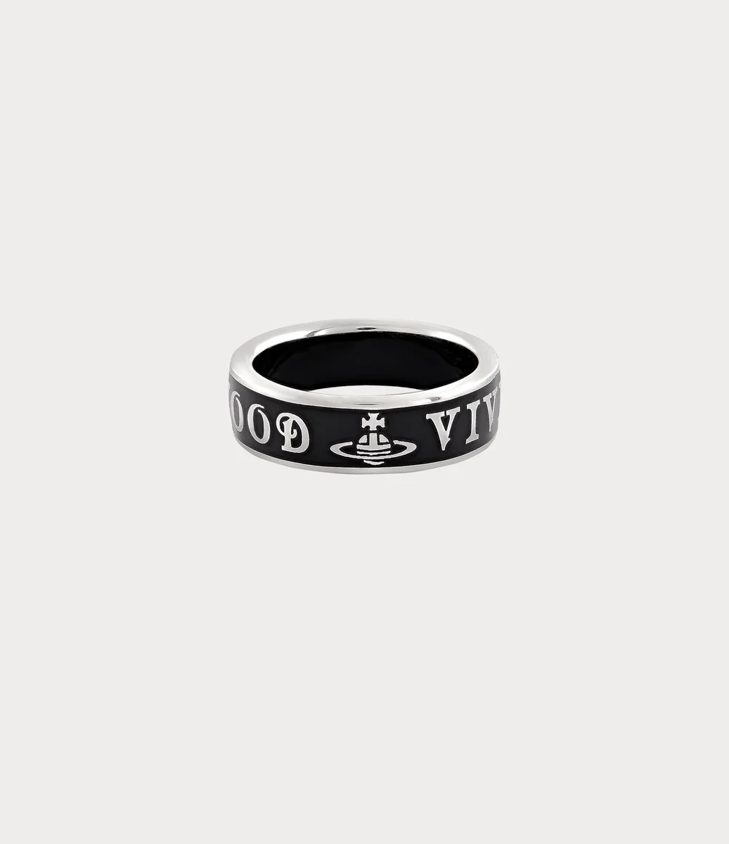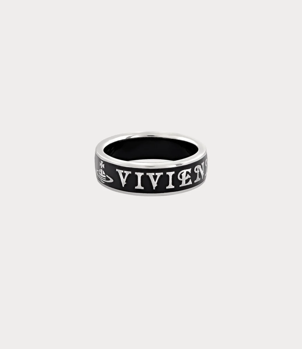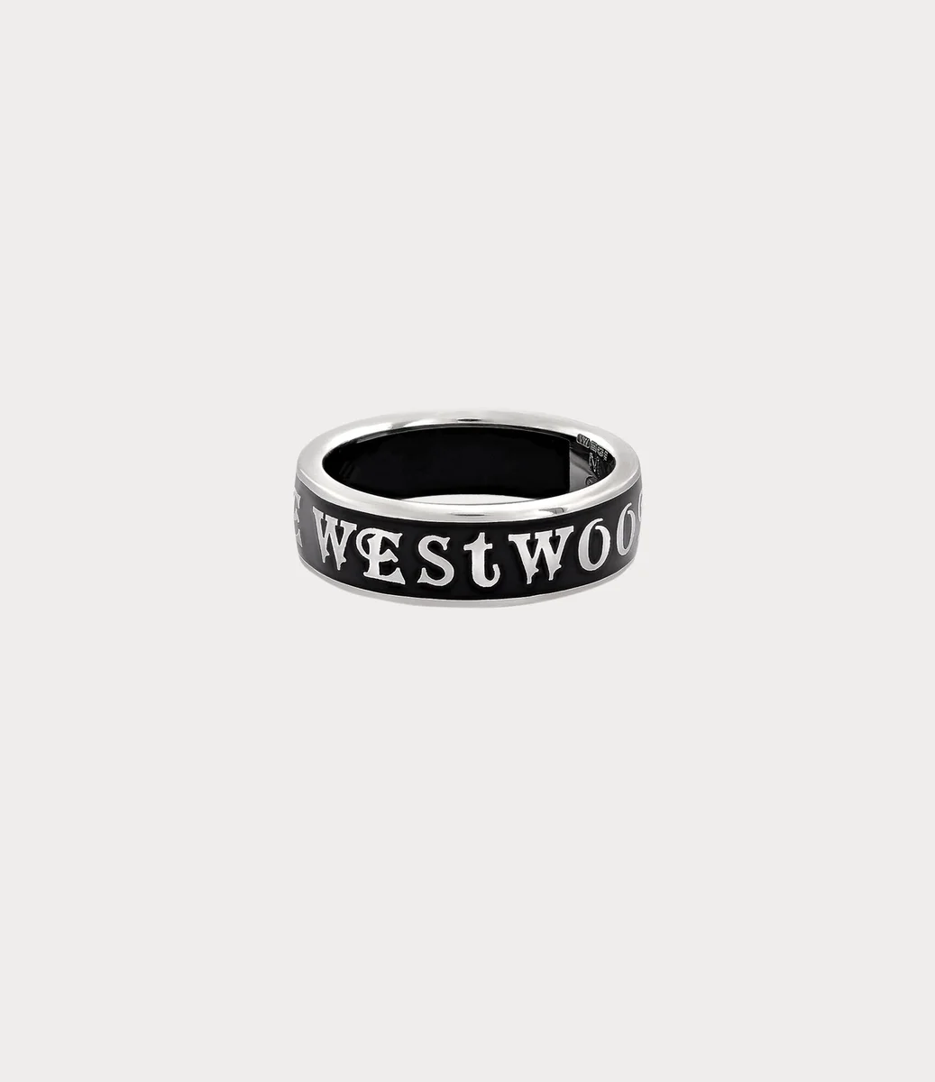 Vivienne Westwood Conduit Street ring is crafted from platinum-plated recycled silver, featuring intricately engraved ‘Vivienne Westwood’ lettering along the band.
