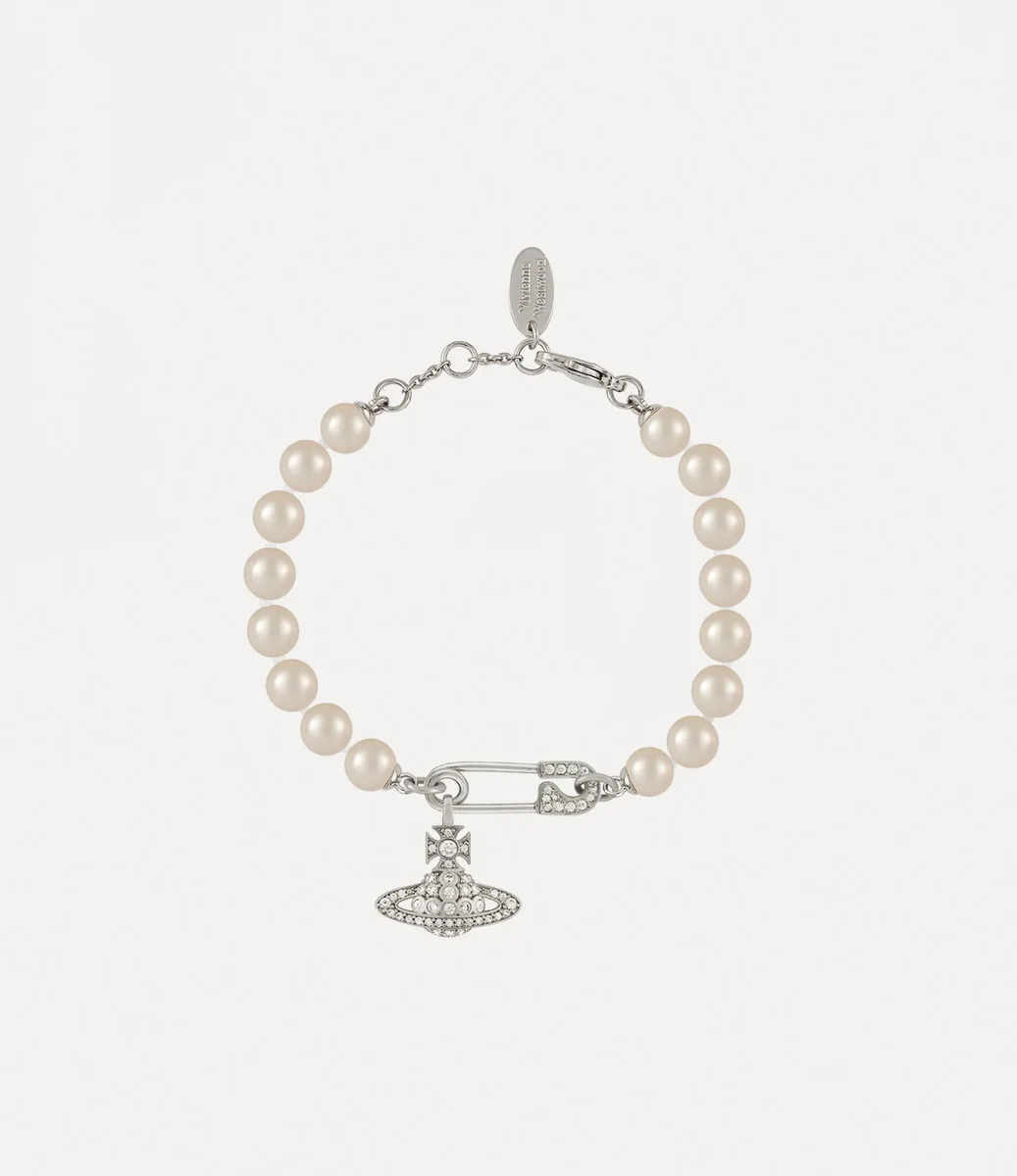 Pearls are a key element of the house’s iconography, representing both luxury and rebellion. The Lucrece Pearl bracelet features a strand of glass-based pearls, accented by a crystal-encrusted orb that dangles from a safety pin charm. This timeless safety pin motif symbolises non-conformity, reflecting Vivienne’s signature punk-inspired approach.