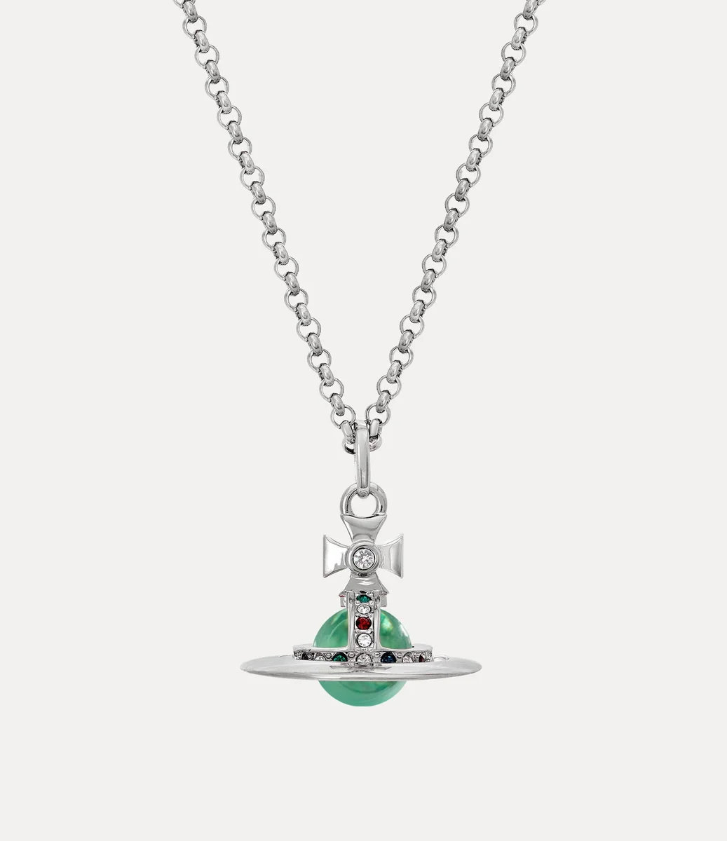 Vivienne Westwood New Tiny Orb Pendant necklace features the classic orb motif with a green spherical glass gemstone, finished with a secure lobster clasp.