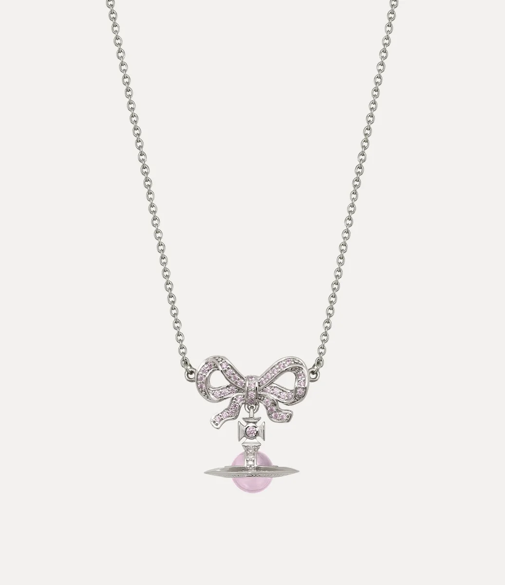 Our Octavie choker receives a bow-shaped design reminiscent of Georgian jewellery, adorned with pavé-set glistening crystals in a pink finish. This piece incorporates our signature three-dimensional dangle orb motif, featuring a finely crafted pink gemstone at its centre.