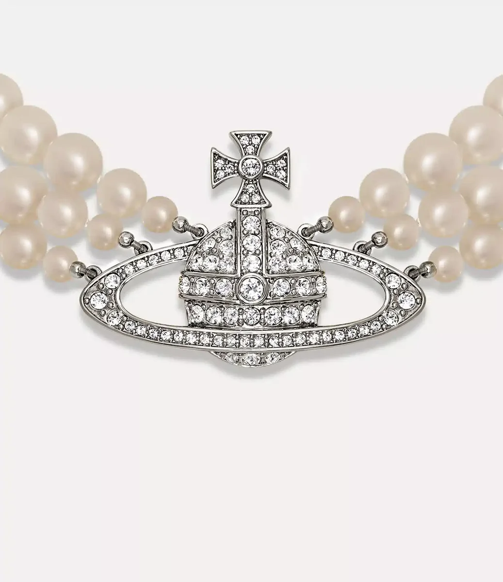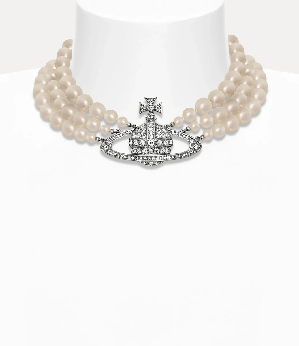 Vivienne Westwood Three Row Pearl Bas Relief choker features pearl detailing with a central bas relief orb adorned with white crystals.