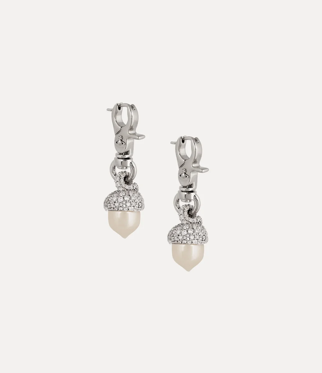 The Lucille Large earrings feature a swivel hardware-style clasp with a secure hinged post, featuring the heritage acorn motif with a shimmering pearl-coated base and pavé crystal-embellished cap. Intricate orb branding engraved on the clasp completes the design, echoing Vivienne’s vision of launching tradition into the future.