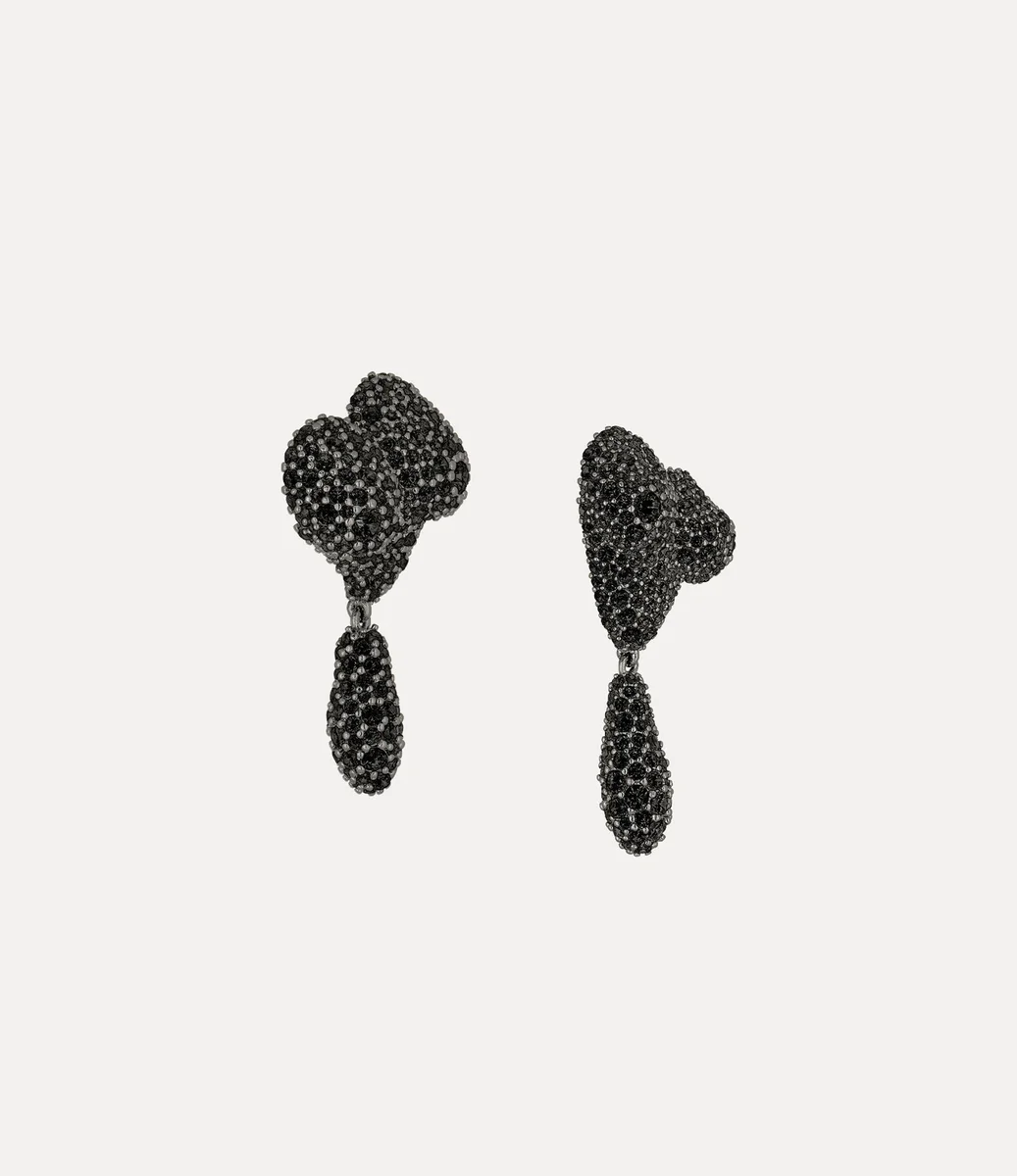 Vivienne Westwood Mimosa Pave earrings revive the house’s classic asymmetrical heart-shaped motif, encrusted with tonal crystal details and complete with a dangling drop.