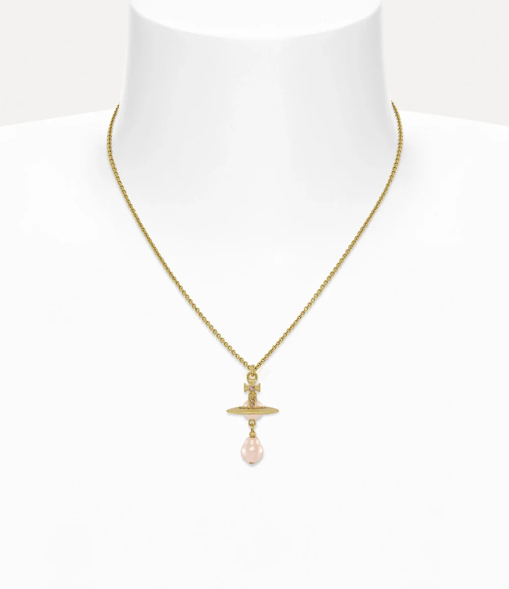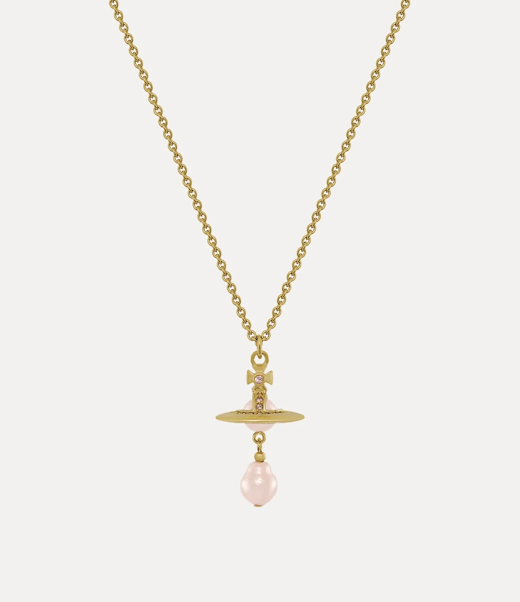 The Aleksa Pendant necklace revives the classic three-dimensional orb motif, embodying the ethos of launching the past into the future. The pendant is adorned with glistening crystals and descends into a baroque glass-based pearl detail, finished in polished, gold-toned plating.