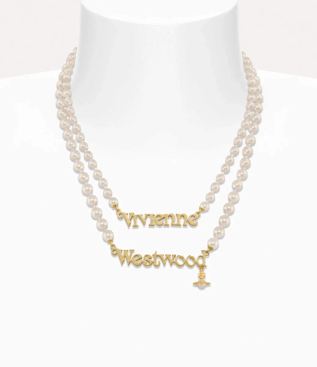 Vivienne Westwood Amelia necklace features two rows of Swarovski glass-based pearls, adorned with the words ‘Vivienne’ and ‘Westwood’, in gold-toned plating.