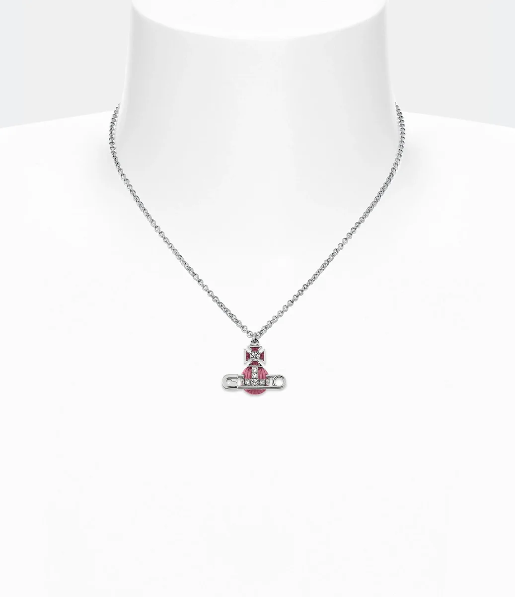 Our Kitty Pendant necklace features our classic orb emblem, hand-painted with translucent rose-coloured enamel to reveal an intricate metal pattern underneath. The piece receives a silver-tone finish, complete with a safety pin motif, a symbol of non-conformity, reminiscent of Vivienne’s signature punk approach.