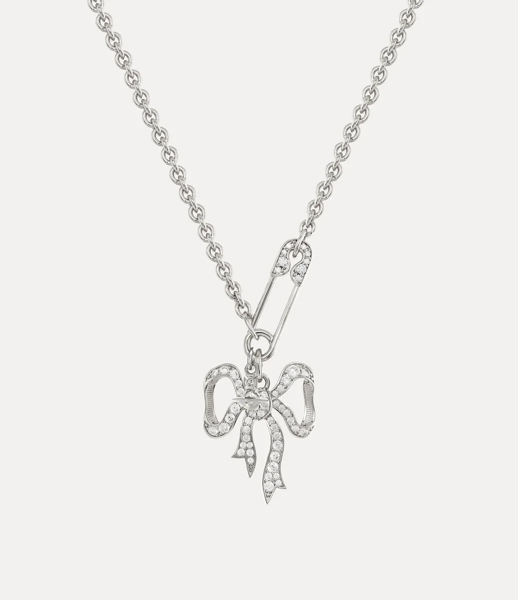 The Lilith Pendant necklace features the house’s signature iconography, pairing a Georgian-inspired bow with a safety pin silhouette that nods to Vivienne’s punk aesthetic. Adorned with white crystals, the silver-tone design is finished with a secure lobster clasp and an orb-branded tag.