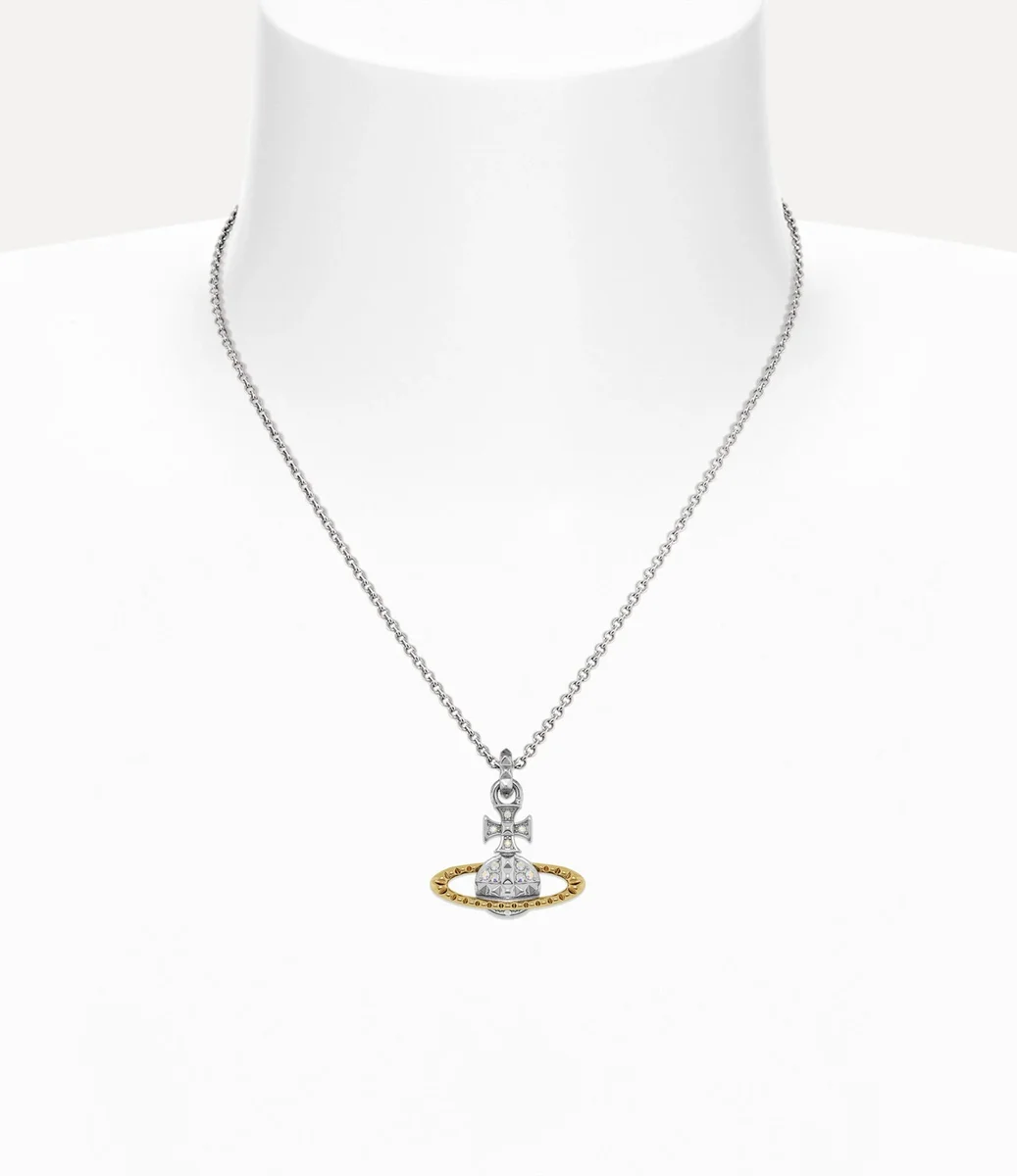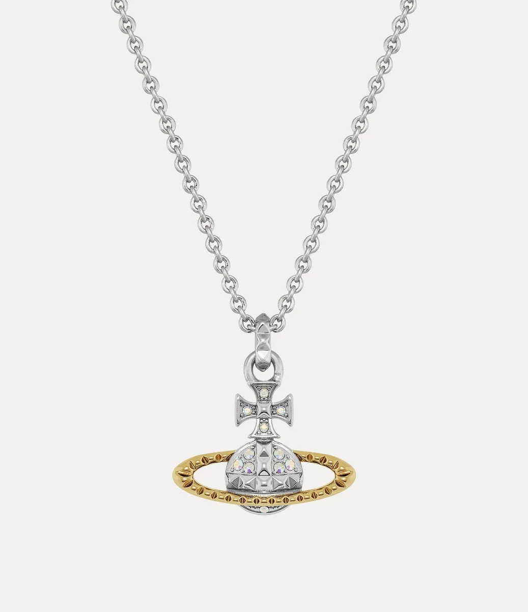 Vivienne Westwood Mayfair Bas Relief Pendant necklace in silver-tone metal features a contrasting gold Saturn ring and iridescent crystal details.