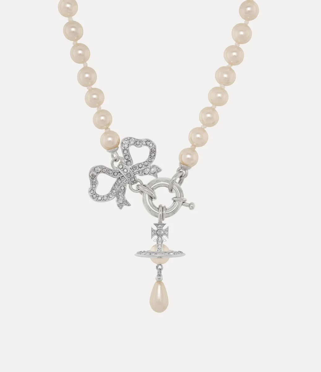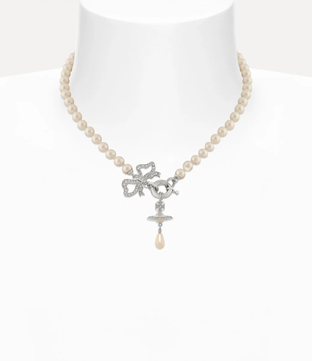 The Rigoberta Pearl necklace, the latest design in the Rigoberta range, features a row of Swarovski glass pearls and an intricate, Georgian-inspired bow charm – an iconic element of the house. At its centre, the three-dimensional orb motif is highlighted by a teardrop pearl detail, finished with a spring-lock fastening.