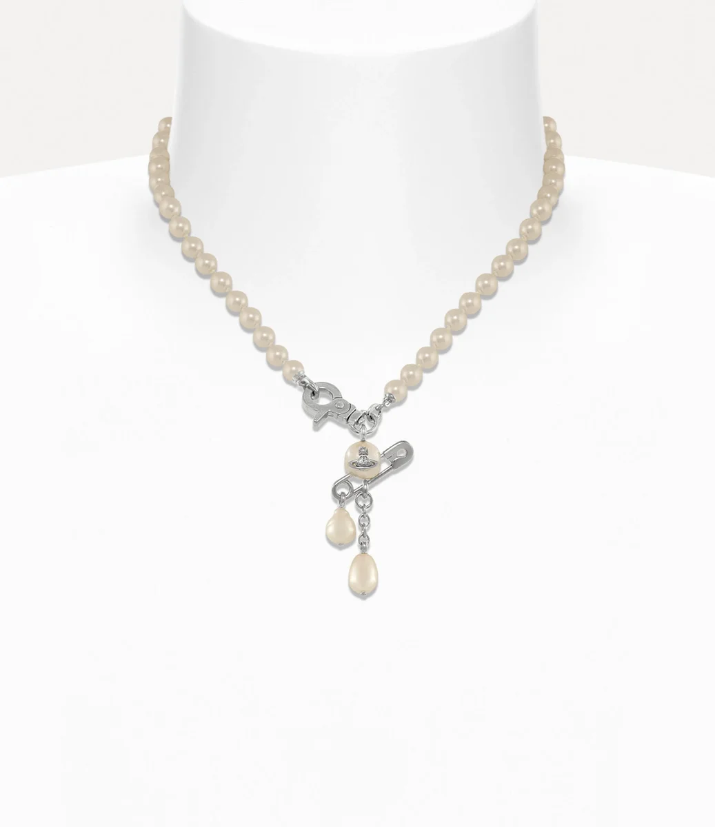 The archival Small Claude Pearl necklace has been updated this season with single row of glistening Swarovski glass pearls, offering a rounded pearl detail in the centre, complete with a classic safety pin pierced through the design – evoking Vivienne’s signature punk aesthetic.