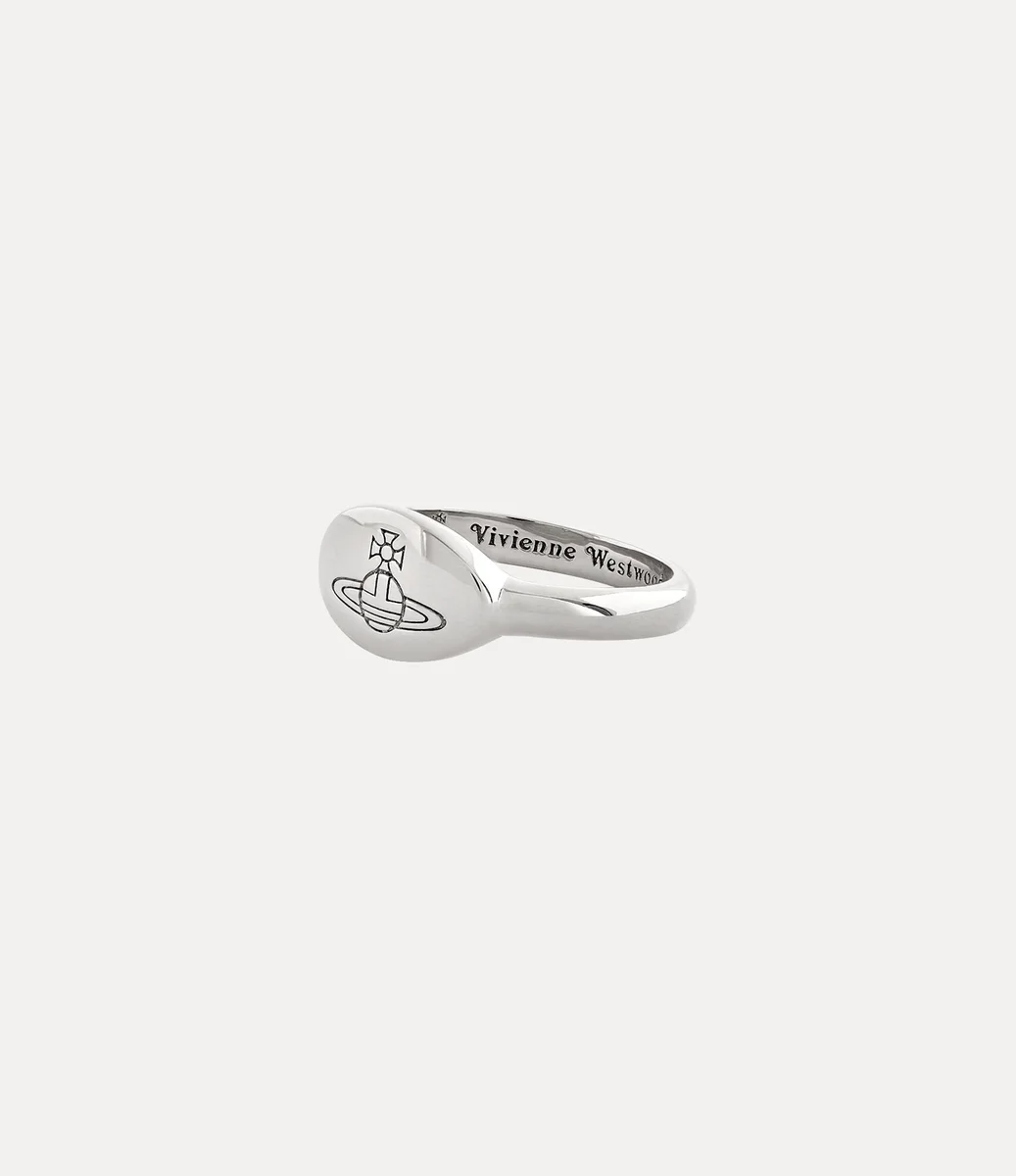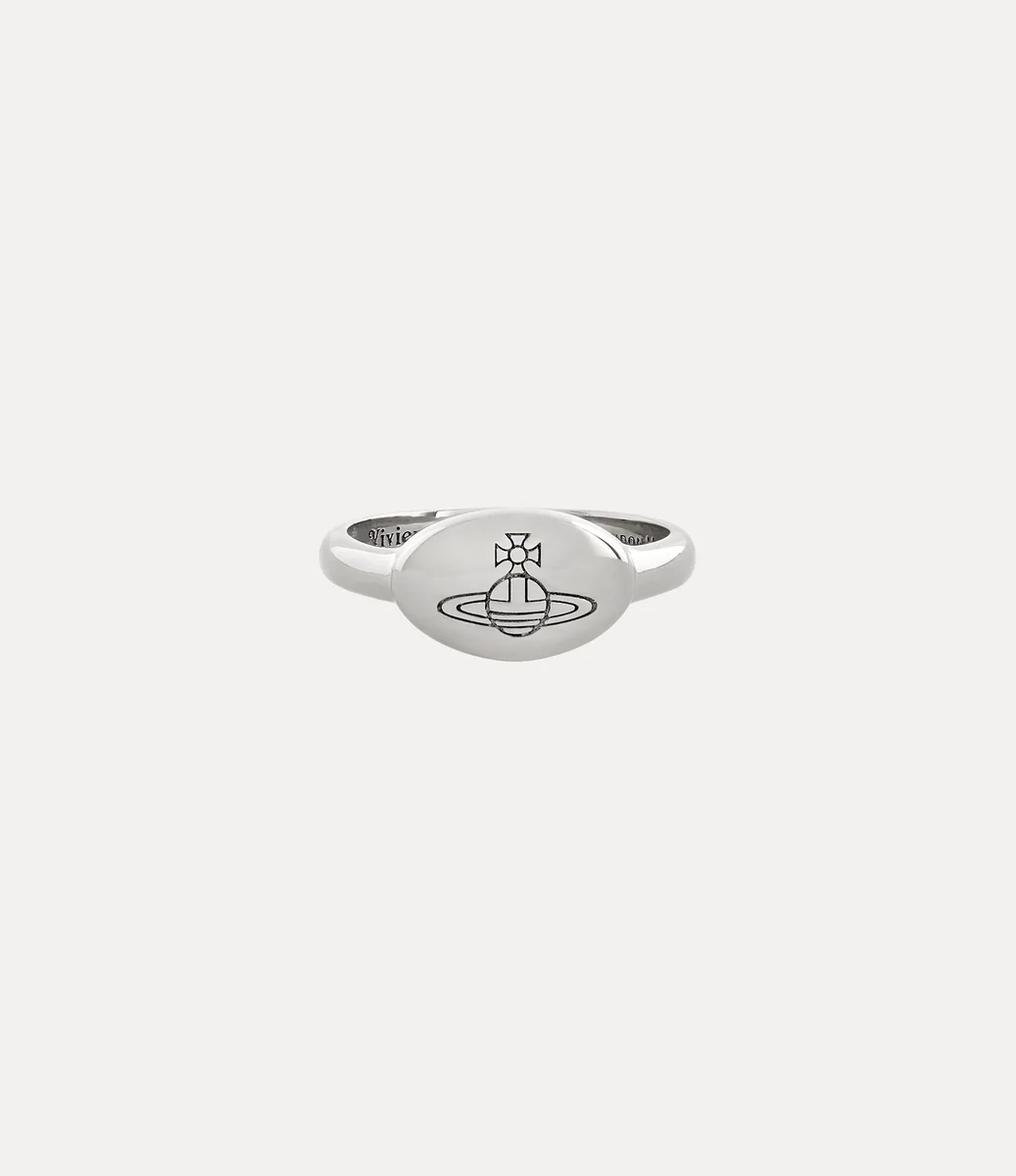 Our Tilly ring features a classic signet silhouette, complete with a recycled silver finish, enhanced by platinum-tone plating. This piece is adorned with an oval-shaped face, featuring an engraving of our signature line orb, enriched with patina to elevate the overall design – recalling Vivienne’s vision of launching tradition into the future.
