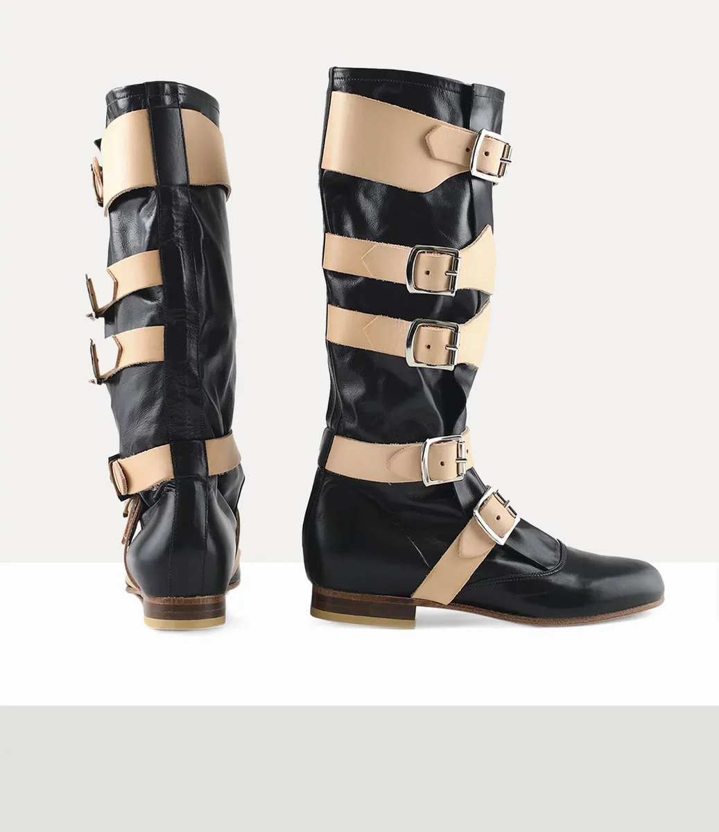 Our Pirate boots were first revealed in the Autumn-Winter 1981 ‘Pirate’ collection, which was influenced by Vivienne’s interest in adventurous pirate stories from the 17th and 18th centuries. The design captures the essence of romanticism and rebellion often linked to pirates, with a wrapped, soft, slouchy leather leg and heavy leather straps detailed with roller buckles that give the boots a rugged, distressed appearance.