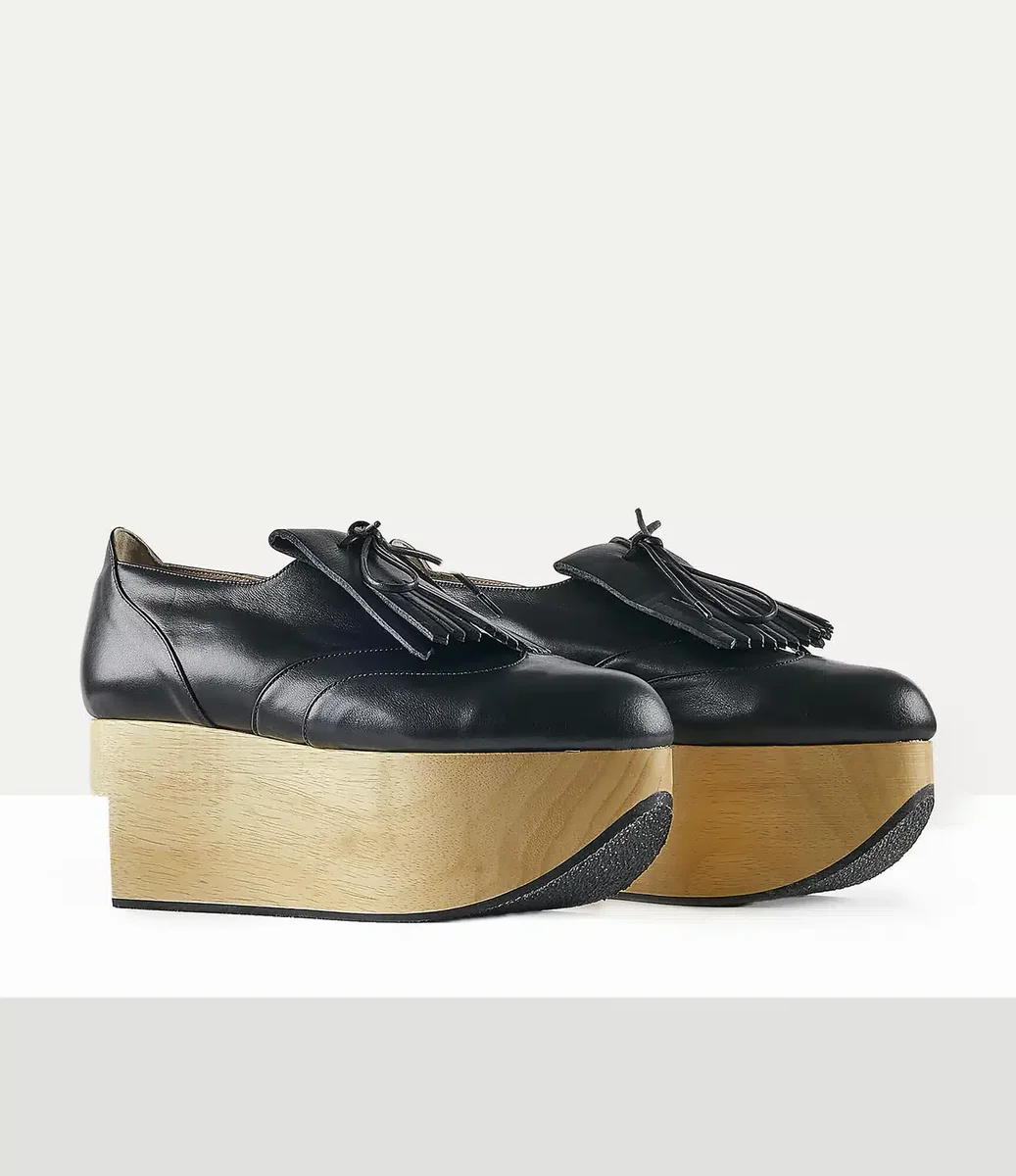 The Rocking Horse Golf shoes take inspiration from classic British golfing footwear, featuring intricate decorative topstitching and a distinctive leather fringe detail that elegantly conceals the laces. The design is elevated by contrasting wooden platform soles, characterised by a curved front and signature cut-out detail – elements first introduced in the Autumn-Winter 1987-88 ‘Harris Tweed’ collection.